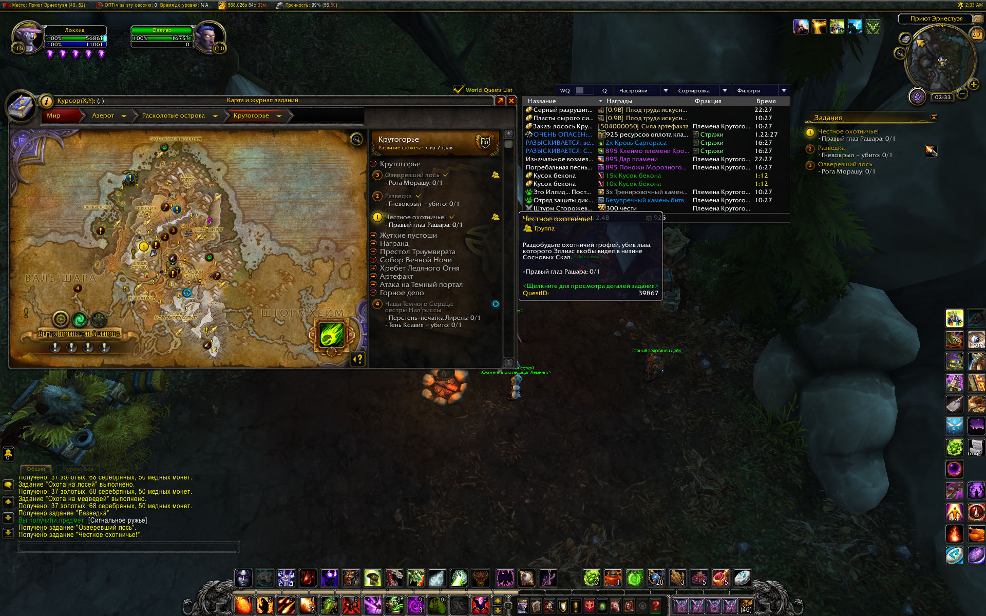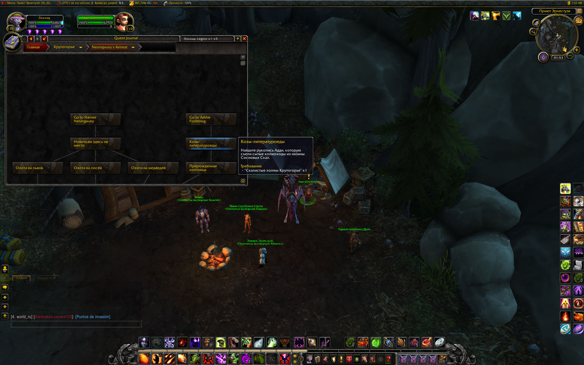 По быстрому пробежался и выполнил обе цепочки (50 мин на все) В процессе делал скриншоты, некоторые добавлю сюда. В общем есть три направляющих квеста, выполнение любого из них открывает доступ к цепочкам. В игре нашел два из них, третий даже не стал искать, смысла нет. это квесты https://ru.wowhead.com/quest=40217 и https://ru.wowhead.com/quest=39417 один отправляет к полетке Эрнестуэя с тотема, второй из лагеря где будет начало второй цепочки, если не сделана первая. после сдачи направляющего квеста открываются сразу два, после которых выдаются и остальные. зависимости, прорисованные в аддоне в общем то соблюдаются. Смотрите скриншоты. И можете сделать у себя скрины цепочек из аддона для сравнения. Дополнение - чтобы стал доступен квест https://ru.wowhead.com/quest=40244/%D1%81%D1%82%D1%80%D0%B0%D0%BD%D0%BD%D1%8B%D0%B9-%D1%82%D0%B8%D0%BF-%D0%B2-%D1%81%D1%82%D1%80%D0%B0%D0%BD%D0%BD%D0%BE%D0%BC-%D0%BA%D0%BE%D1%81%D1%82%D1%8E%D0%BC%D0%B5 и вся цепочка мурлоков нужно выполнить предварительно цепочку Эрнестуэя, которая начинается, например с квеста https://ru.wowhead.com/quest=39417 или https://ru.wowhead.com/quest=40217 http://tracker.legionbugs.com/file_download.php?file_id=13569&type=bug http://tracker.legionbugs.com/file_download.php?file_id=13570&type=bug |