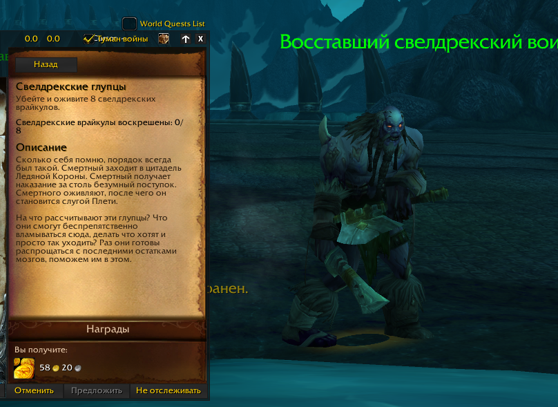 | Description | Квест оплота класса, находится в локации Яма Сарона. Выдает два кв Минерва Воронья Скорбь, один из них "Свелдрекские глупцы". По квесту надо убить 8 врайкулов (т.е. воинов) и воскресить их, но по какой-то причине они отмечаются как дружелюбные мобы. Без этого квеста не могу дальше сценарий пройти | ||||