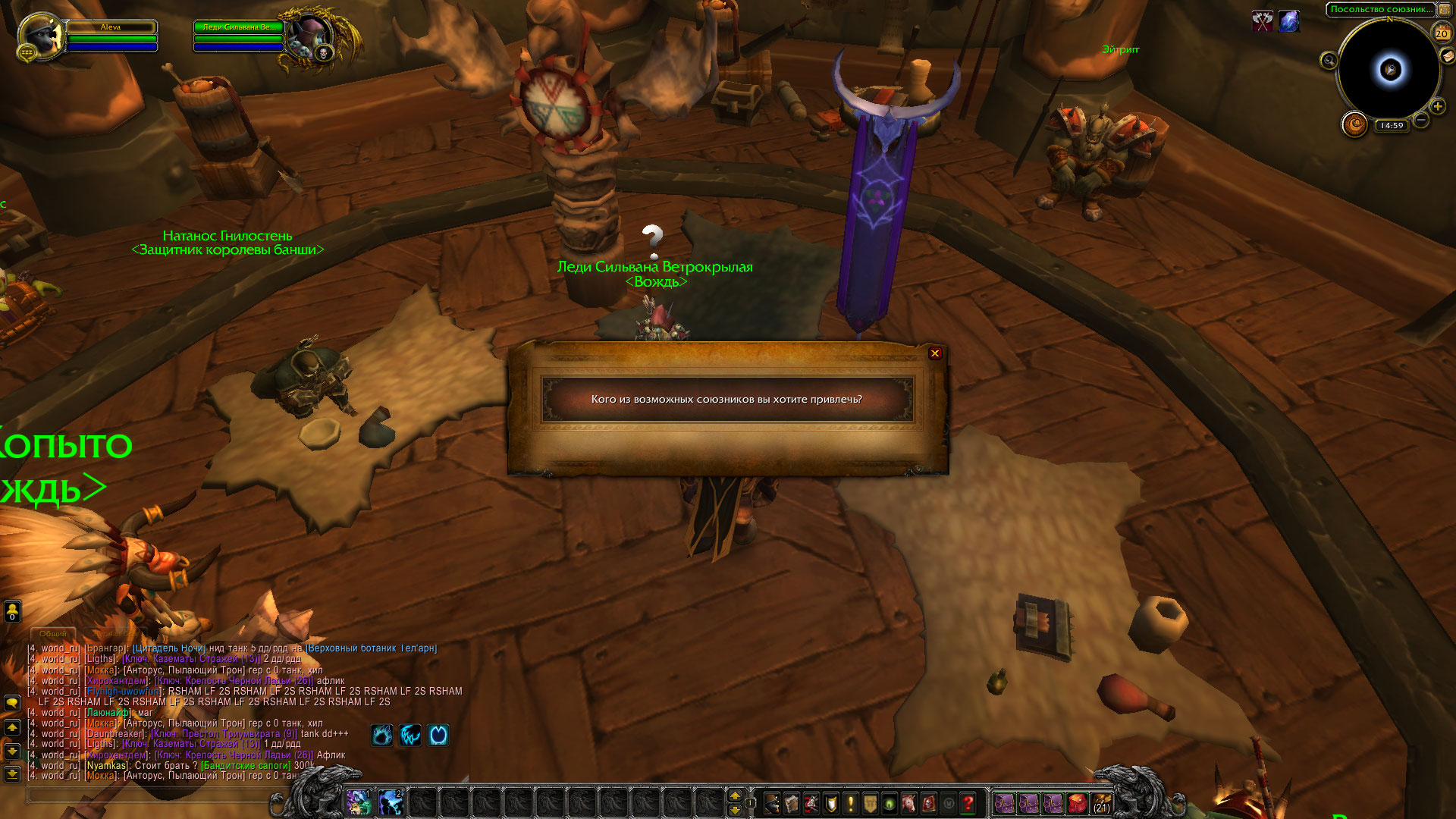 | Description | Ник игрового персонажа. Alevi, Aleva Ссылка с http://ru.wowhead.com/ на проблемный квест (обязательно) https://ru.wowhead.com/quest=50242/%D0%B2%D1%8B%D0%B1%D0%BE%D1%80-%D1%81%D0%BE%D1%8E%D0%B7%D0%BD%D0%B8%D0%BA%D0%BE%D0%B2 Описание сложившейся ситуации. Берется квест, говорю с подсвеченными тауреном Крутогорья и ночнорожденной, потом с Сильваной "Я готова к поискам новых союзников" далее выскакивает окно с надписью "Кого из возможных союзников вы хотите привлечь?" и больше на нем ничего нет и нет возможности выбора. | ||||