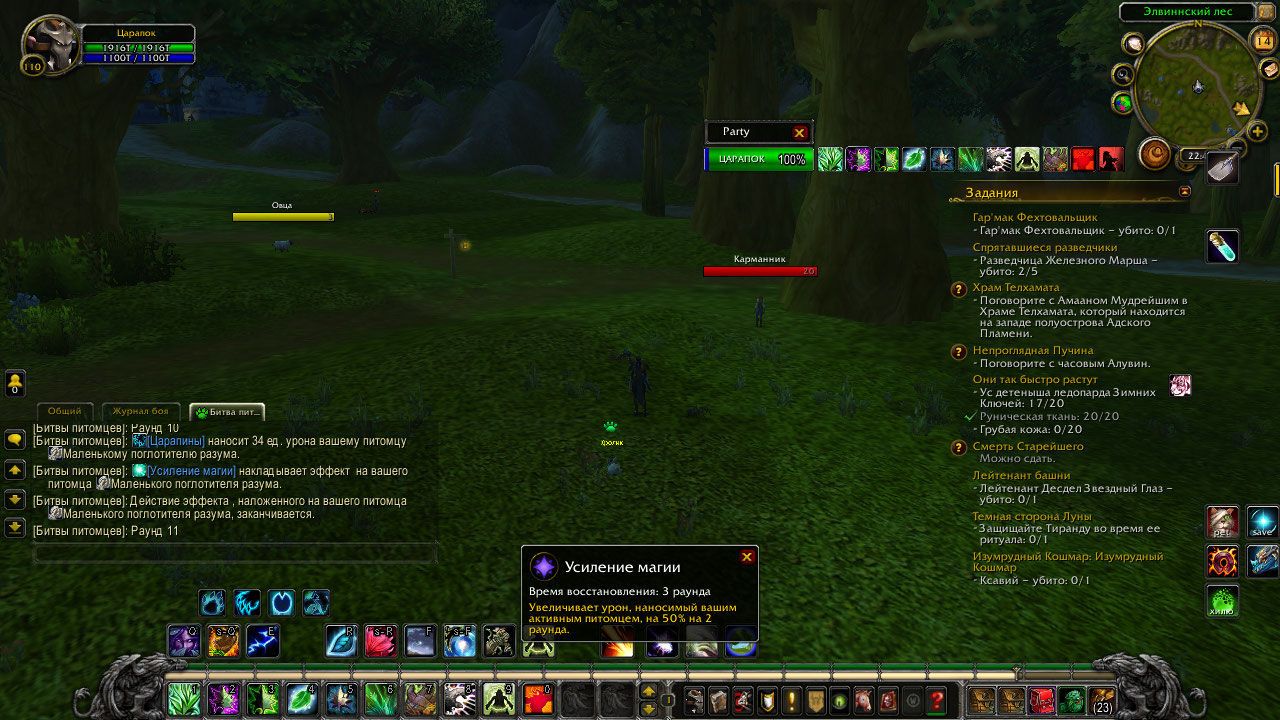| Steps To Reproduce | Взять в бой питомца со способностью, которая накладывает эффект на несколько ходов, в бою использовать эту способность, увидеть в логе битвы, что эффект снят. На скриншоте в логе боя видно, что в 10 раунде Маленький поглотитель разума накладывает на себя эффект Усиление магии, но сразу же действие эффекта заканчивается. | ||||