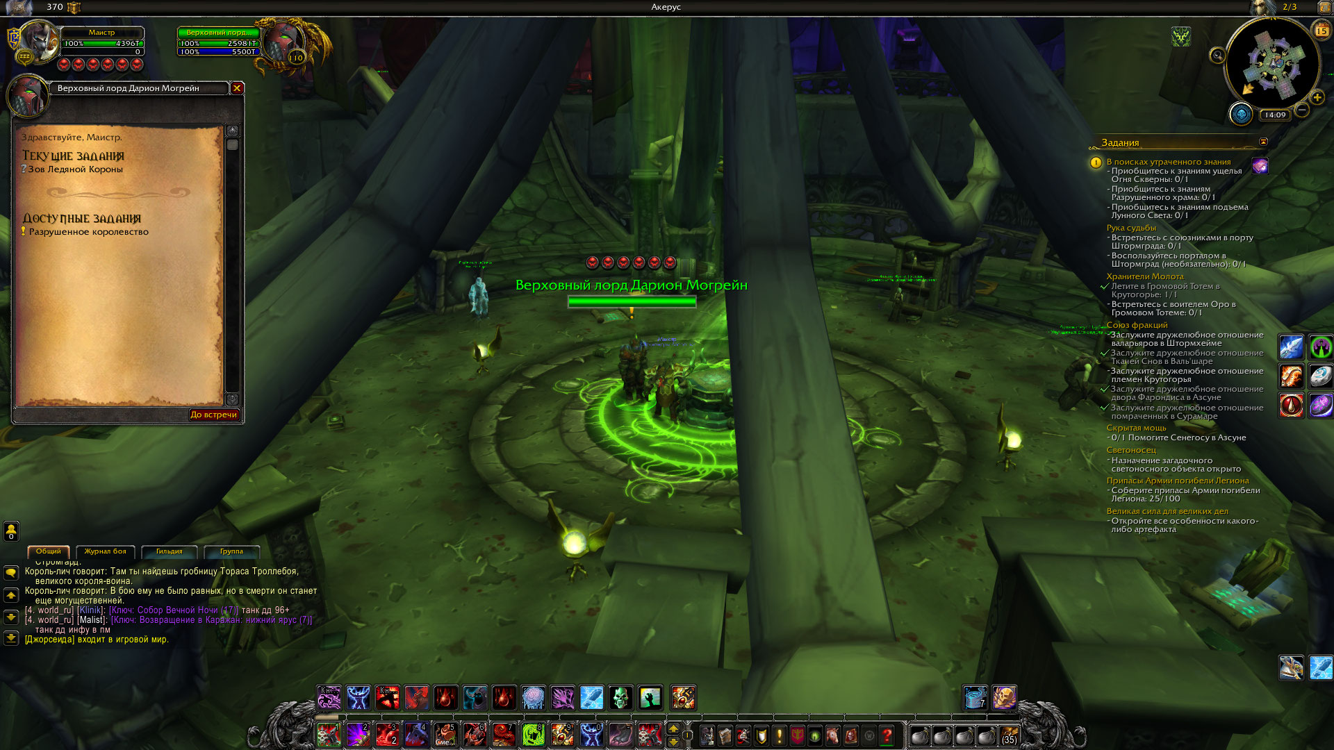 Откройте карту, справа от карты список квестов. выберите верхний уровень иерархии (Мир) , тогда все категории квестов свернутся и Вы увидите их все все. разворачивайте категории Артефакт, Рыцарь Смерти и смотрите какие квесты там есть. Сделайте скрин списка квестов со свернутыми и развернутыми категориями. У меня три ДК, на всех я проходил арт фроста первым, в слабом гире. Умирал неоднократно, приходилось отменять квест и брать заново. Одна проблема - это было давно, я уже не помню точно где я это делал. Что можно сделать не отменяя квеста - поискать портал. Выглядеть он должен как врата смерти. то есть фиолетовый треугольник в воздухе. Пробежаться по обоим этажам Акеруса, посмотреть на площадке Краса, может быть портал стоит где то и рядом с ним нет уже никаких НПС. Но я точно помню, что была проблема с активацией врат (второй этап сценария) и я несколько раз перезапускал квест в течение нескольких дней. Еще можно попробовать открыть вратав Акерус скилом ДК находясь в Акерусе и находясь в Даларане возле полетки. Может при взятом квесте врата отправят в ледяную корону. Я просто не помню, а посмотреть не на ком. везде арты получены давно. Что можно сделать еще - найти все таки в книге квестов этот квест и отменить его, а потом искать Ланкрала, чтобы взять квест еще раз. Или на верхнем этаже Акеруса или в Даларане на площадке Краса. Но лучше бы не отменяя квест найти портал. |
