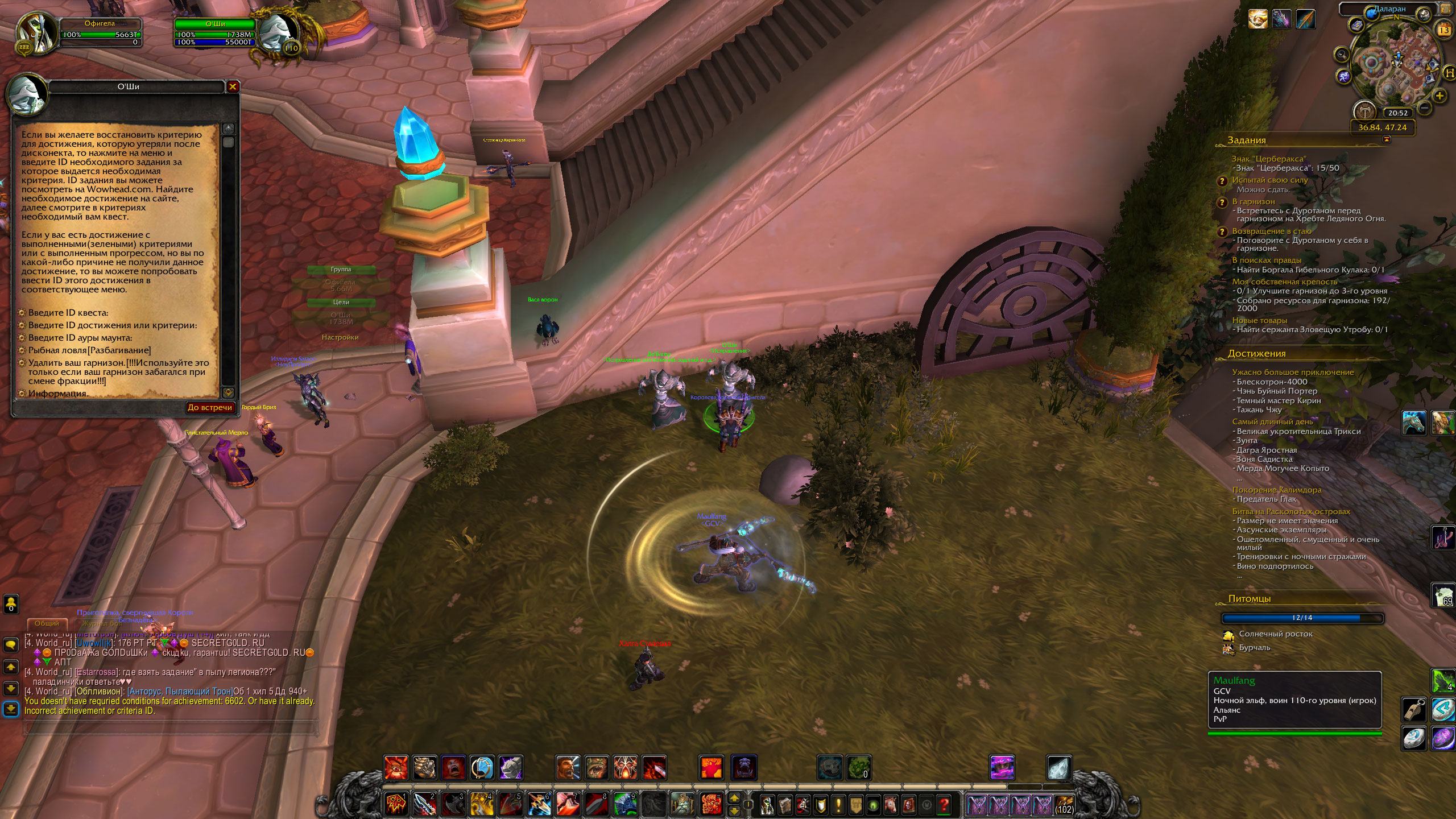Здравствуйте, перезачесть достижение не получилось? Для того что бы перезачесть достижение вам нужно подойдит к нпс О'ши, который находится в вашей столице, после чего вам нужно выбрать пункт второй. 6602 21407 попробуйте вписать эти айдишники. |