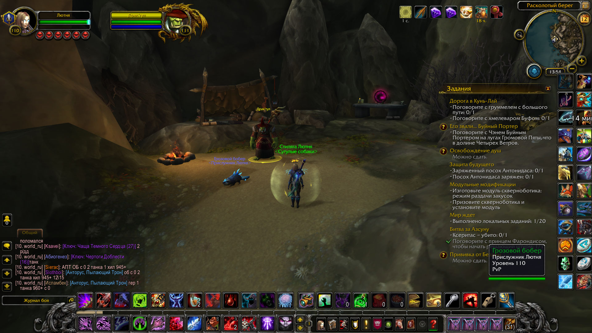 Здравствуйте! Если вы только начали цепочку, то диалог у https://ru.wowhead.com/npc=102695 появится после https://ru.wowhead.com/quest=46734 Следующий диалог появится после нахождения https://ru.wowhead.com/item=139783 Дальше нужно проверить использование сфер, все ли вы использовали (если вы остановились на этом этапе). Вот макрос для проверки: /run local a={43730,43731,43732,43733,43734,43735,43736,43737,43760,43761}; for i,q in ipairs(a) do print(format("Orb%s: %s",i, IsQuestFlaggedCompleted(q) and "Done" or "Not Done")) end |