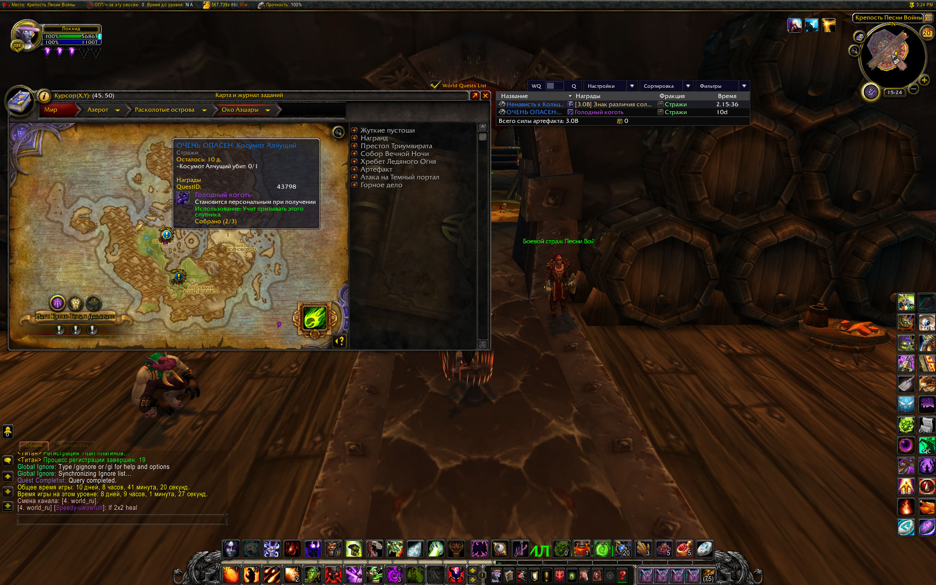 18 скорее всего локалка на Косумота была активна, так как на сегодня осталось 10 дней. И стоит обратить внимание на первый вариант, предложенный Alica228. так как есть вопрос к Alica228 - в локации Око Азшары постоянно активны от трех до семи элитных локальных заданий, которые не отображаются в полном списке аддона и на карте. Но по прилету в локацию все они автоматически принимаются. Это бонусные локалки стражей или просто аддон , которым я пользуюсь устаревший? |