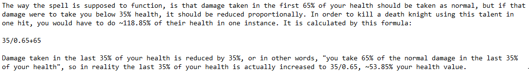 | Steps To Reproduce | 1. Have a Blood Death Knight without selecting the talent WOTN (https://ru.wowhead.com/spell=206967/%D0%B2%D0%BE%D0%BB%D1%8F-%D0%BC%D0%B5%D1%80%D1%82%D0%B2%D1%8B%D1%85) 2. Take damage equalling as close to 100% of your health as possible while being at 100% health (above 35%), without using any defensives/procs/cooldowns. 3. Record the damage taken. 4. Now select the WOTN talent (https://ru.wowhead.com/spell=206967/%D0%B2%D0%BE%D0%BB%D1%8F-%D0%BC%D0%B5%D1%80%D1%82%D0%B2%D1%8B%D1%85) 5. Take the *same* damage in step 2 while being at 100% health (above 35%), without using any defensives/procs/cooldowns. 6. Record the damage taken and note how it has not been reduced despite selecting the WOTN talent. 7. If WOTN has reduced the damage taken, then assuming spell that did damage should have done exactly 100% of the player's health, the player should have only taken 87.75% of their health in damage (35*0.65 + 65 = 87.75) | ||||