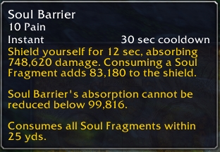 The Guardian Druid talent Brambles uses a similar unbreakable absorb mechanic. https://legion-shoot.tauri.hu/?spell=203953 You could think of the 99,816 minimum absorb on the screenshot as a much stronger Brambles, but with a 12 second duration (and no damage reflection of course). I used this talent a lot during Legion and would usually activate the shield with 0 soul fragments, since the ~100k armor against all attacks was the important part. This was a very effective strategy against DoTs and trash mobs as they would hit you frequently for small amounts of damage, so -100k from each attack was very significant. The talent wasn't very good against big hits such as those from raid bosses, as reducing a big hit like 2 million by 100k is much less significant. |