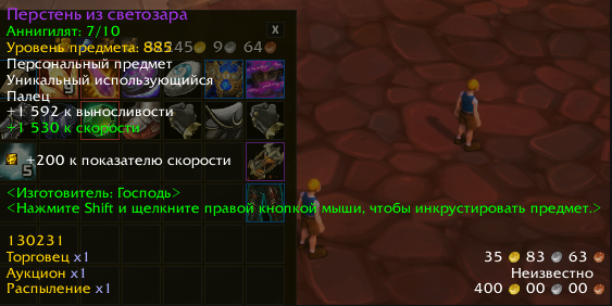 | Description | Купил кольцо на аукционе со статами 1400 скорости 400 искусности , улучшил 6 раз аннигилятом все было нормально скорости стало 2000+ искусности 500+ ,на 7 раз кольцо стало 1500 скорости и потеряло искусность ,почините и верните кольцо пожалуйста . Ресторшамка | ||||