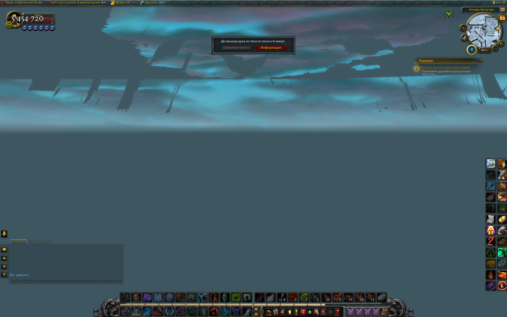 Здравствуйте! Существует баг, при котором после релога координаты персонажа меняются до неузнаваемости. Вот пример: https://egammi.net/image/SysQ Я оказался в Великом море и единственный способ выбраться оттуда была усталость. Иногда телепортирует в точку между Пандарией Восточными Королевствами, иногда под горы на юге Восточных Чумных Земель. Баг пока отловить не удалось, но он есть. |