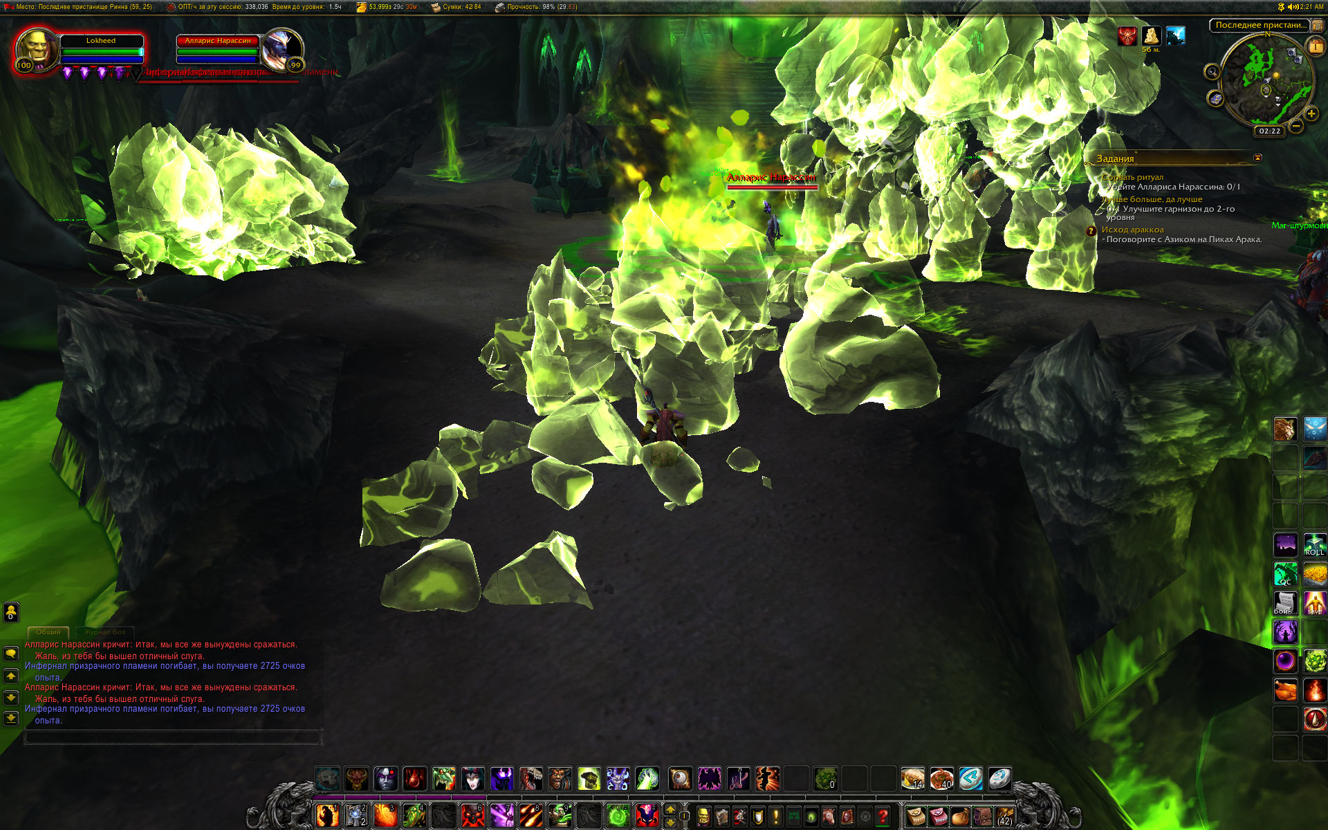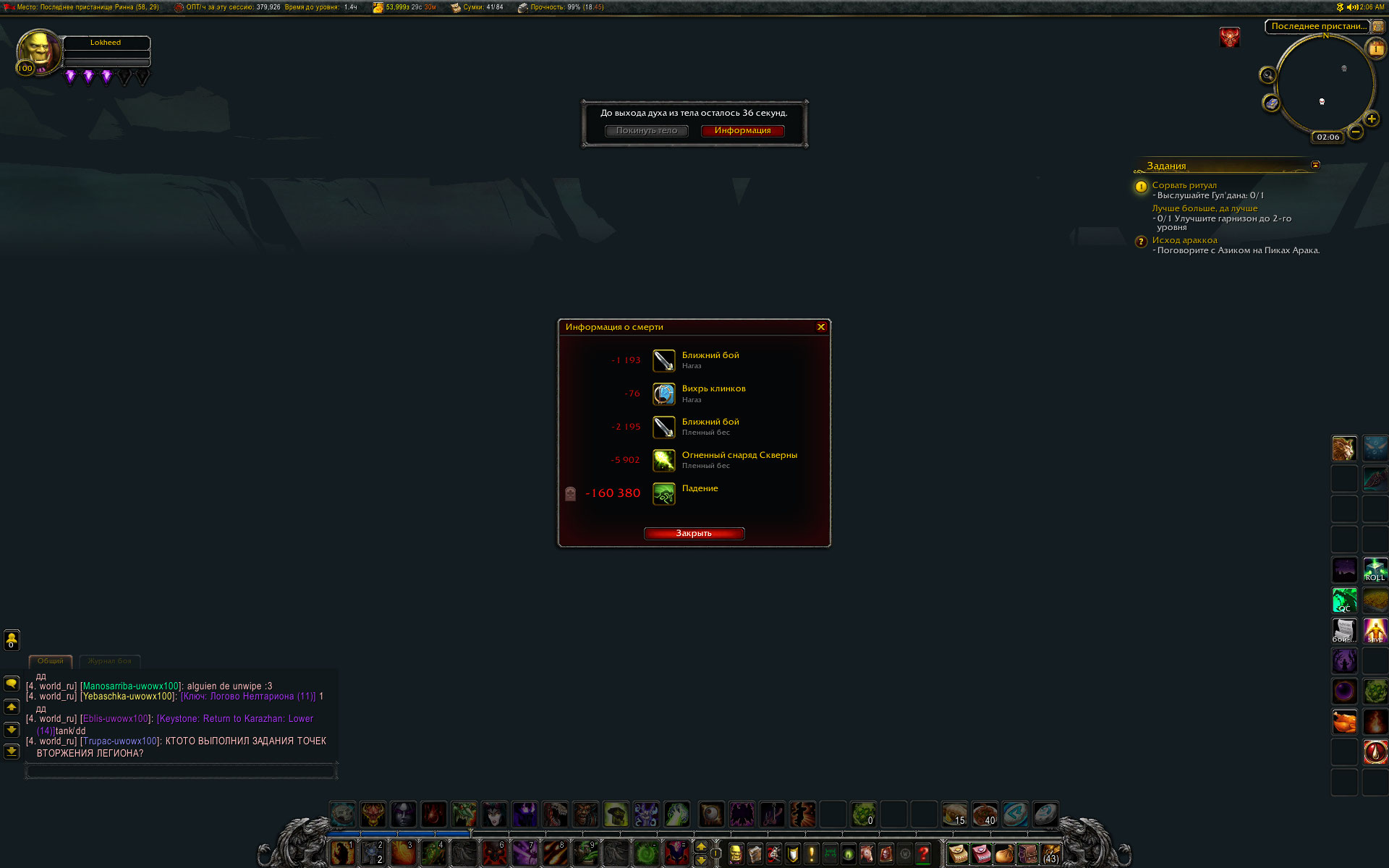 | Description | В квесте https://ru.wowhead.com/quest=43254/%D1%81%D0%BE%D1%80%D0%B2%D0%B0%D1%82%D1%8C-%D1%80%D0%B8%D1%82%D1%83%D0%B0%D0%BB варлок должен прилететь на расколотый берег к Гробнице Саргераса, постоять там, потом убить моба, забрать артефакт и вернуться в Даларан. Не повезло раз - гоблин. Нетопырь привозит на Расколотый берег и сгружает под текстуры. Смерть от падения. Не повезло два - 99 уровень. https://ru.wowhead.com/npc=110556/%D0%B0%D0%BB%D0%BB%D0%B0%D1%80%D0%B8%D1%81-%D0%BD%D0%B0%D1%80%D0%B0%D1%81%D1%81%D0%B8%D0%BD , становится враждебным и по КД (каждые десять секунд, призывает https://ru.wowhead.com/spell=221323/%D0%BF%D1%80%D0%B8%D0%B7%D1%8B%D0%B2-%D0%B8%D0%BD%D1%84%D0%B5%D1%80%D0%BD%D0%B0%D0%BB%D0%B0-%D0%BF%D1%80%D0%B8%D0%B7%D1%80%D0%B0%D1%87%D0%BD%D0%BE%D0%B3%D0%BE-%D0%BF%D0%BB%D0%B0%D0%BC%D0%B5%D0%BD%D0%B8 , заполняя остальное время между призывами кастами спеллов https://ru.wowhead.com/spell=221309/%D0%BF%D0%BE%D1%85%D0%B8%D1%89%D0%B5%D0%BD%D0%B8%D0%B5-%D0%B6%D0%B8%D0%B7%D0%BD%D0%B8 и https://ru.wowhead.com/spell=79932/%D1%81%D1%82%D1%80%D0%B5%D0%BB%D0%B0-%D1%82%D1%8C%D0%BC%D1%8B . Инфернал , если его атаковать, пинается, отбрасывая персонажа метров на 80, с одного пинка отправляет за пределы зоны боя. Естественно, добежать и продолжить убивание Аллариса проблематично, он выходит из боя раньше и снова унего полное ХП, только инфернал вернулся и встал рядом. В общем, если долго пинать Аллариса, то за это время он успевает накастовать пару десятков инферналов, которые группой стоят вокруг постамента с артефактом. И забрать арт оказывается также нетривиальной задачей. Все получилось конечно, процесс занял около часа времени. Просто интересно, так и должно быть в плане количества призываемых инферналов? | ||||