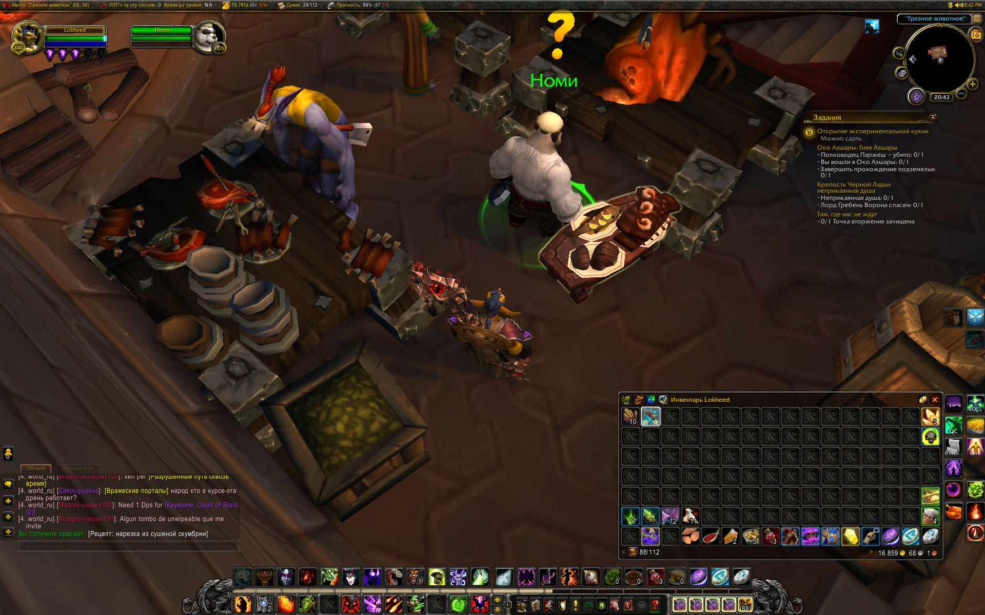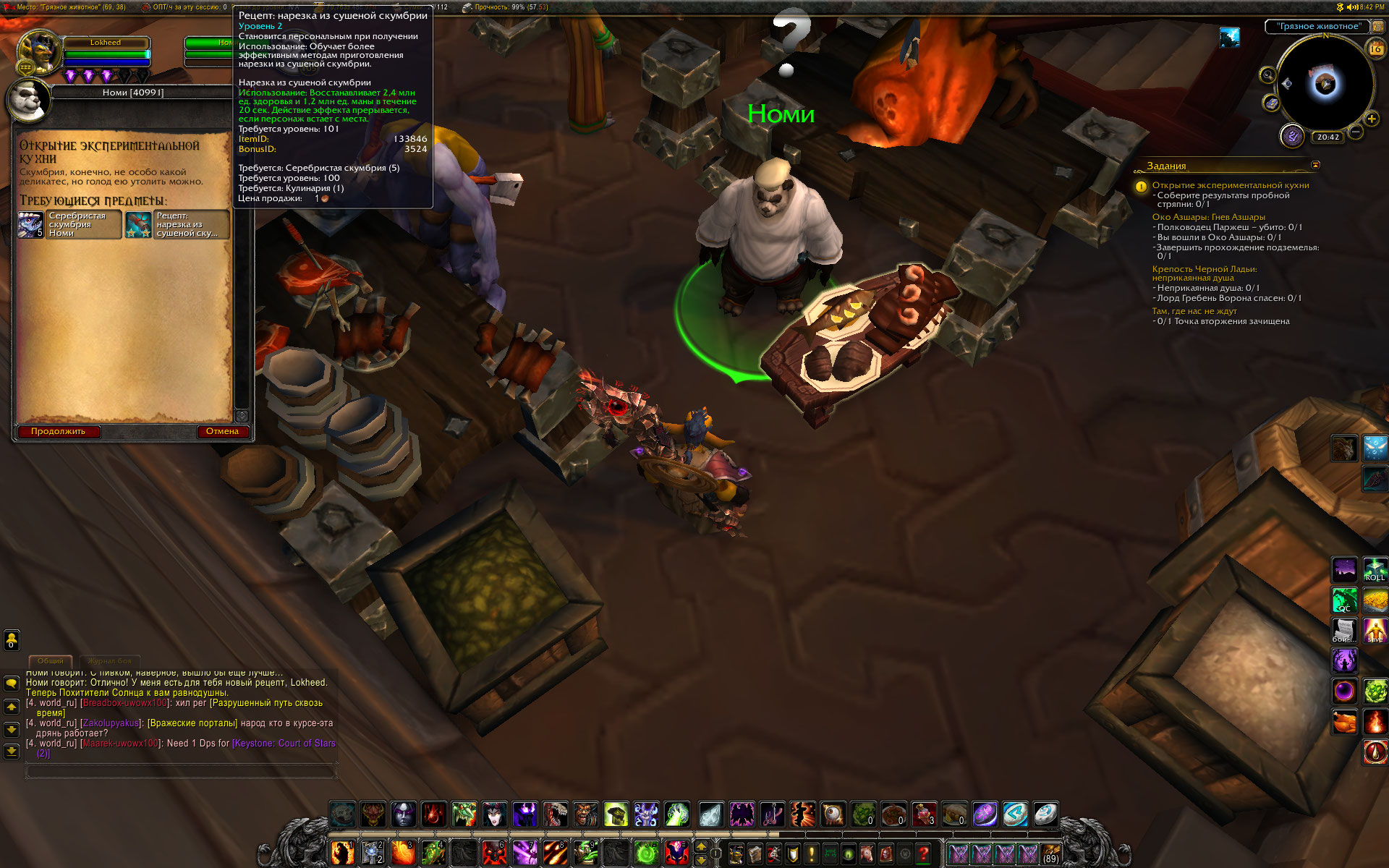 Похоже акция "По одной штуке Номи в каждую руку" закончилась. Выбил один рецепт, изучил, прилетел в Даларан - Номи с квестом "Слишком много поваров" не появился. В таверне пустой диалог. Кстати кулинария 700/700. Слетал в Азсуну к Фарондису - там Номи также не появился. Ладно, выбил еще один рец, с рецептом покатался по Азсуне в Даларане. Ничего. Выучил второй рецепт - ничего и нигде. Что то ситуация мне не нравится :) посмотрю еще после рестарта, что будет. Хотя вполне возможно, что Алиса напишет сейчас, что кулинария переписана и теперь для открытия кулинарии Легиона и исследований у Номи требуется добыть все шесть рецептов в поле. раньше я намекал на то, что у Номи в столе заказов может застрять результат выполнения квеста "Открытие экспериментальной кухни" и типа квест выполнен, но НПС не отпущен на волю. Может поэтому у меня его нету, что он гоняется за Вашим персонажем? Сделать 1-2 заказа на исследования и забрать готовые заказы. Выполнено? |