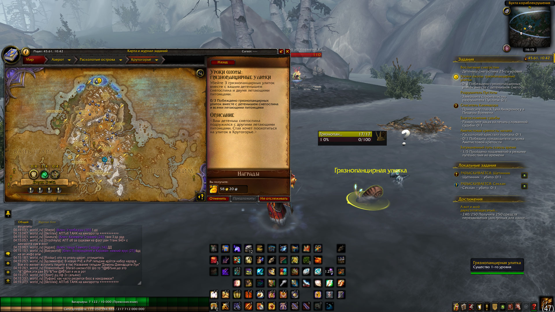 | Description | Квест Уроки охоты: грязнопанцирные улитки невозможно выполнить, потому как с грязнопанцирными улитками нельзя начать бой питомцев, их можно только убить, что не помогает | ||||