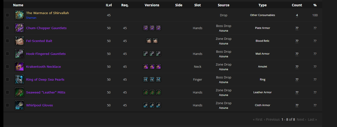 Tukhan GTFO. wowhead is pure crap. check this https://www.wowdb.com/items/139573-the-warmace-of-shirvallah - Levantus 79249 kills = 1.4% drop rate. https://blizzardwatch.com/2016/10/12/totem-talk-shaman-hidden-artifact-appearances/ https://feverclan.com/forums/threads/hidden-artifact-weapon-guides.101631/ I gave enough proofs that the drop should NOT be 100%, there is even 10% or 5% and not even close. so now you can just silently go to hell, and not whine .. |