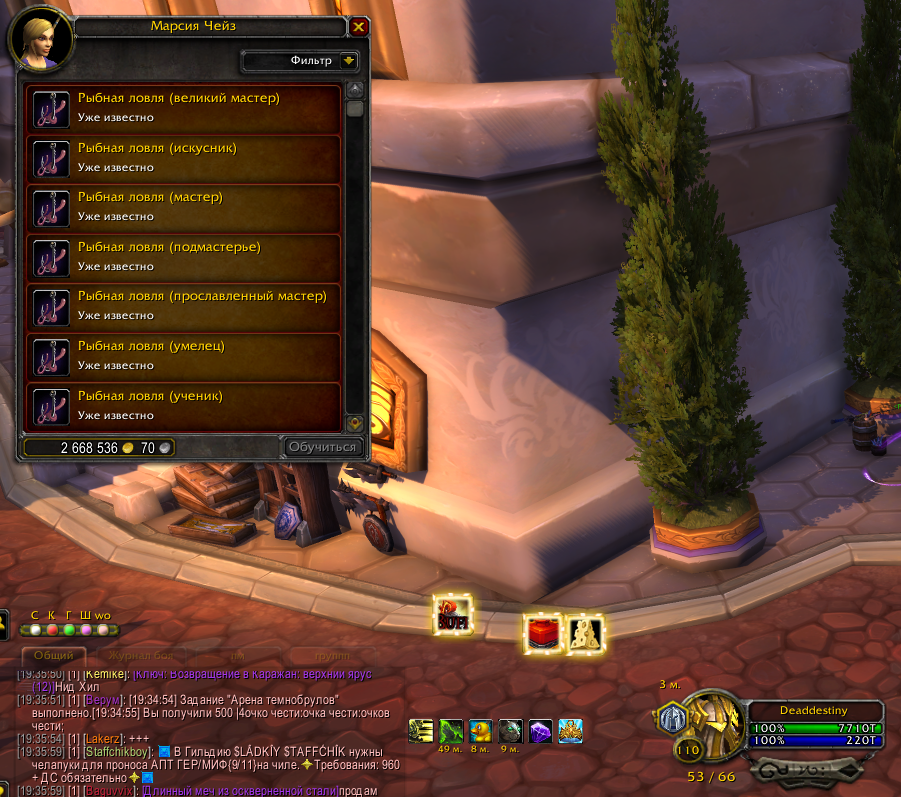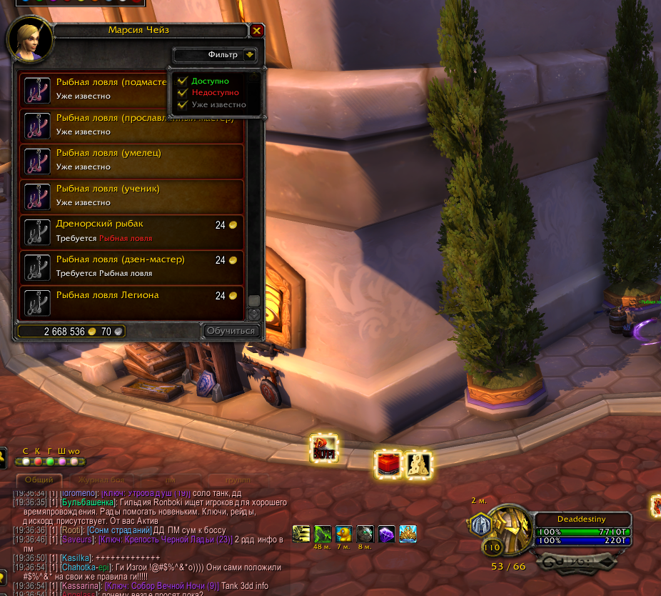 Даларан (Легион) - https://ru.wowhead.com/npc=95844/%D0%BC%D0%B0%D1%80%D1%81%D0%B8%D1%8F-%D1%87%D0%B5%D0%B9%D0%B7#comments подходите к тетке, открываете диалог, выбираете - хочу учиться. справа вверху настраиваете фильтр - ставите птицы везде - Доступно, Недоступно, Уже известно. делаете скриншот , скриншот сюда Можно аналогичное действо сделать в столице фракции, у учителей рыбной ловли. зы. когда навык рыбалки достигнет 600, выдвигайтесь в Дренор, в стартовую локацию вашей фракции и ловите там рыбу, поймаете https://ru.wowhead.com/item=111356/%D1%80%D1%83%D0%BA%D0%BE%D0%B2%D0%BE%D0%B4%D1%81%D1%82%D0%B2%D0%BE-%D0%BF%D0%BE-%D1%80%D1%8B%D0%B1%D0%BD%D0%BE%D0%B9-%D0%BB%D0%BE%D0%B2%D0%BB%D0%B5-%D0%BD%D0%B0-%D0%B4%D1%80%D0%B5%D0%BD%D0%BE%D1%80%D0%B5 - лимит навыка поднимется до 700. Добьете до 700 - сможете выучить Легионовский навык (до 800) |