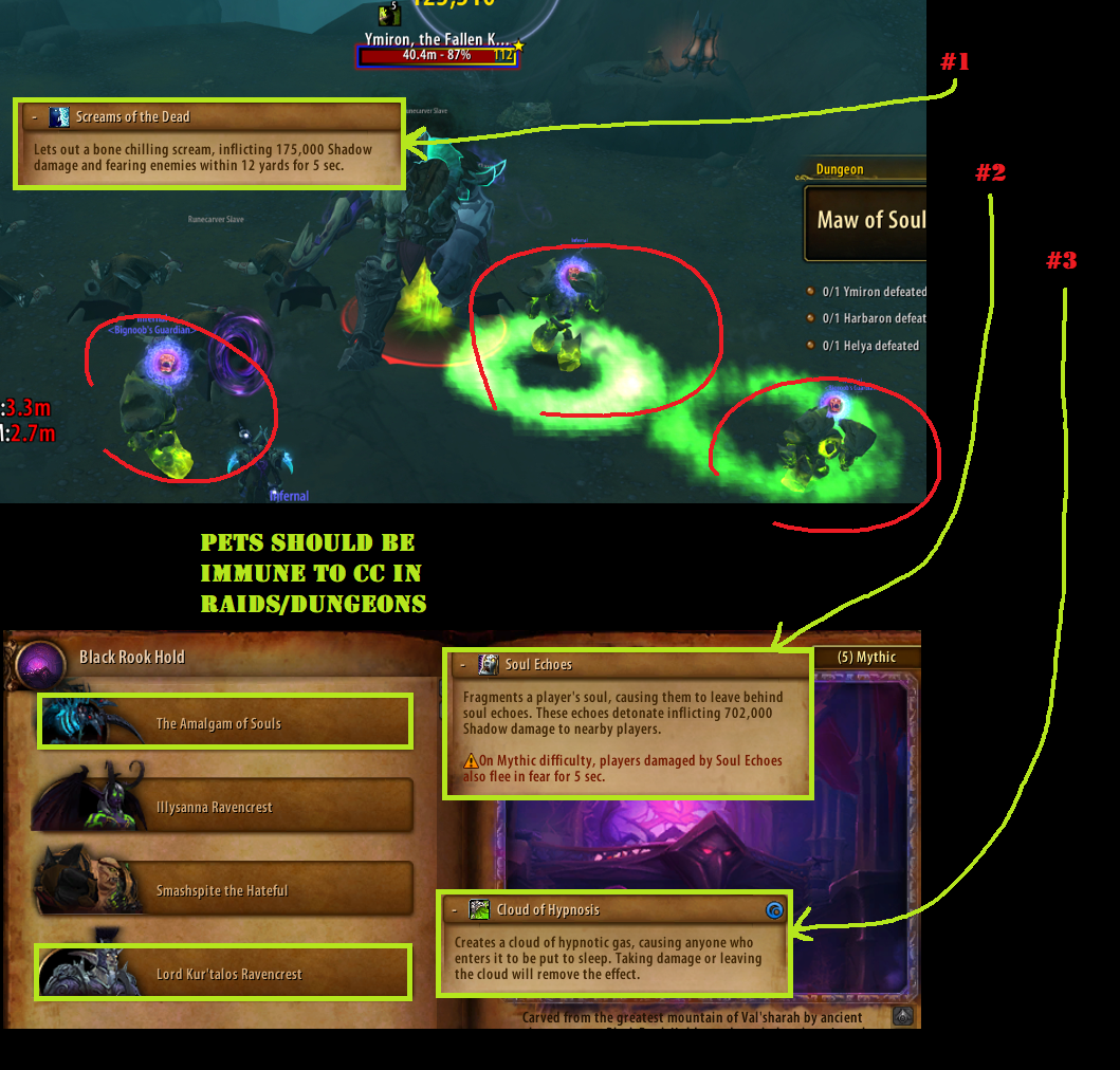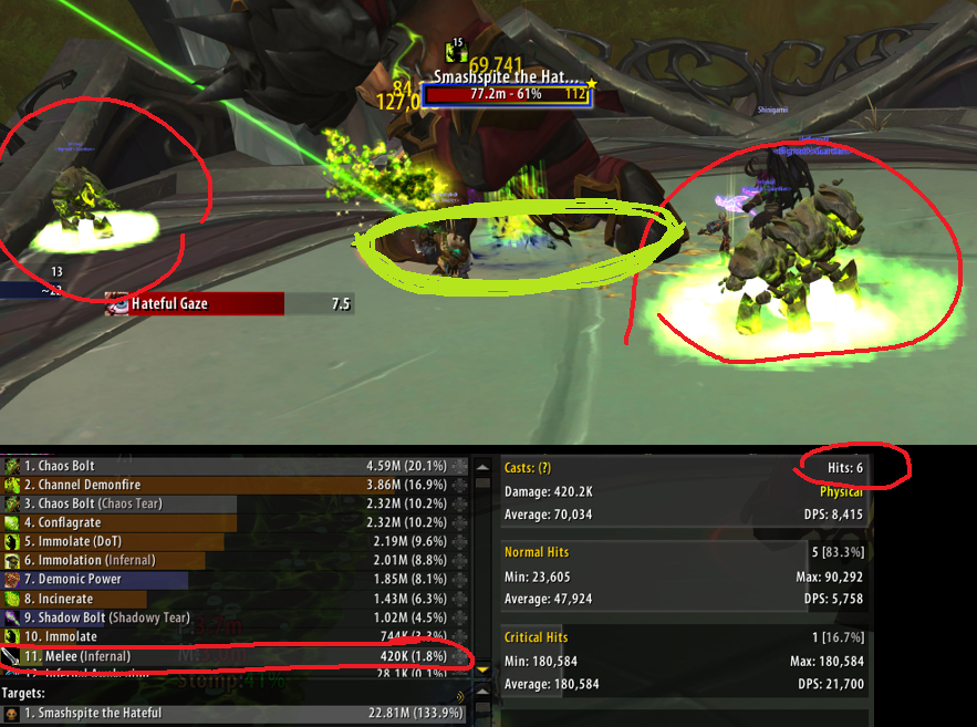 | Description | 'Summon Infernal' on destruction warlock with 'Lord of Flames' golden trait do not attack their target most of the time. The problem seems to be that they are too far from melee range, but they think they are not so instead of moving closer to the target they just afk and do no damage. If tank moves the boss that might fix it sometimes if you get lucky and they get closer to boss. Some bosses have smaller hitboxes and on those it happens more often. Also pets get feared when they should be immune to fear. For example on first boss in maw of souls or first boss in black rook hold. Same issue happens on affliction with 'Grimoire of Supremacy' talent. If doomguard pet is too far from the target it will not move closer and instead it will stand there doing no damage. Possible fixes: - Increase melee range of infernal pets - Make pets immune to fear - Make pets stay closer to their target Thank you. | ||||