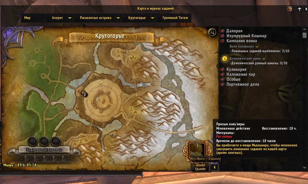 | Steps To Reproduce | Прокачал "Призыв Валь'кир" в оплоте воинов. появился квест "Мощь валь'кир". По квесту получил "Рог войны" использовал его на карте для выполнения локального задания в крутогорье "Заказ: слово силы". Квест "Мощь валь'кир" выполнился, но награда за локальное задание не было и на карте локальное задание осталось. | ||||
