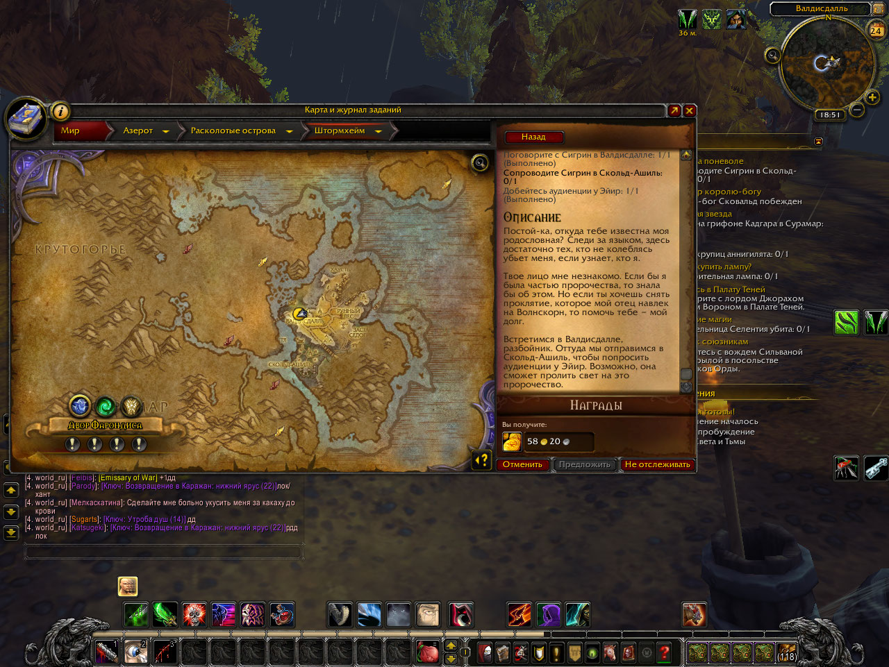 Насколько помню. Валдисдаль, С краю стоит Сигрид. С ней надо поговорить и потом не отставая сопроводить к входу в храм внизу. Рогой можно в стелсе проскочить мимо стражниц, на Сигрид никто не агрится из посторонних НПС, только 2-3 пака призываемых бандитов. Путь , по которому нужно вести - мимо тренировочной площадки, поверху, потом вниз между входом в лагерь Альянса, поворот вниз под мост и по городищу валькир к храму. Нападают, точно помню почти в начале пути, потом там где спуск в городище, внимательно смотреть, там мобы сквозь камни со всех сторон набегают, если убить не всех, то агро останется висеть. Чего не помню - пускает ли внутрь храма, если предварительно не была выполнена сюжетка Штормхейма (преграждающий щит на входе в храм) |