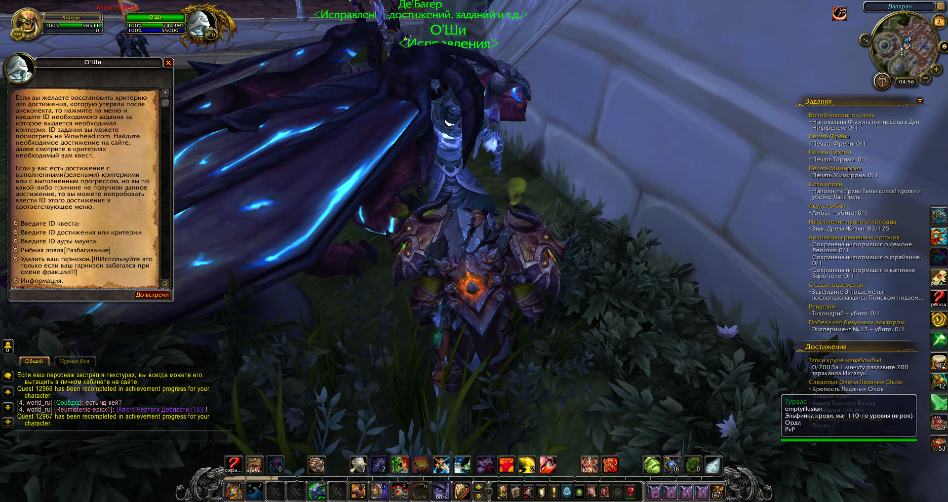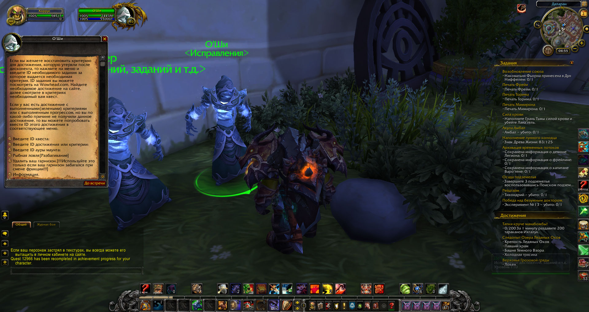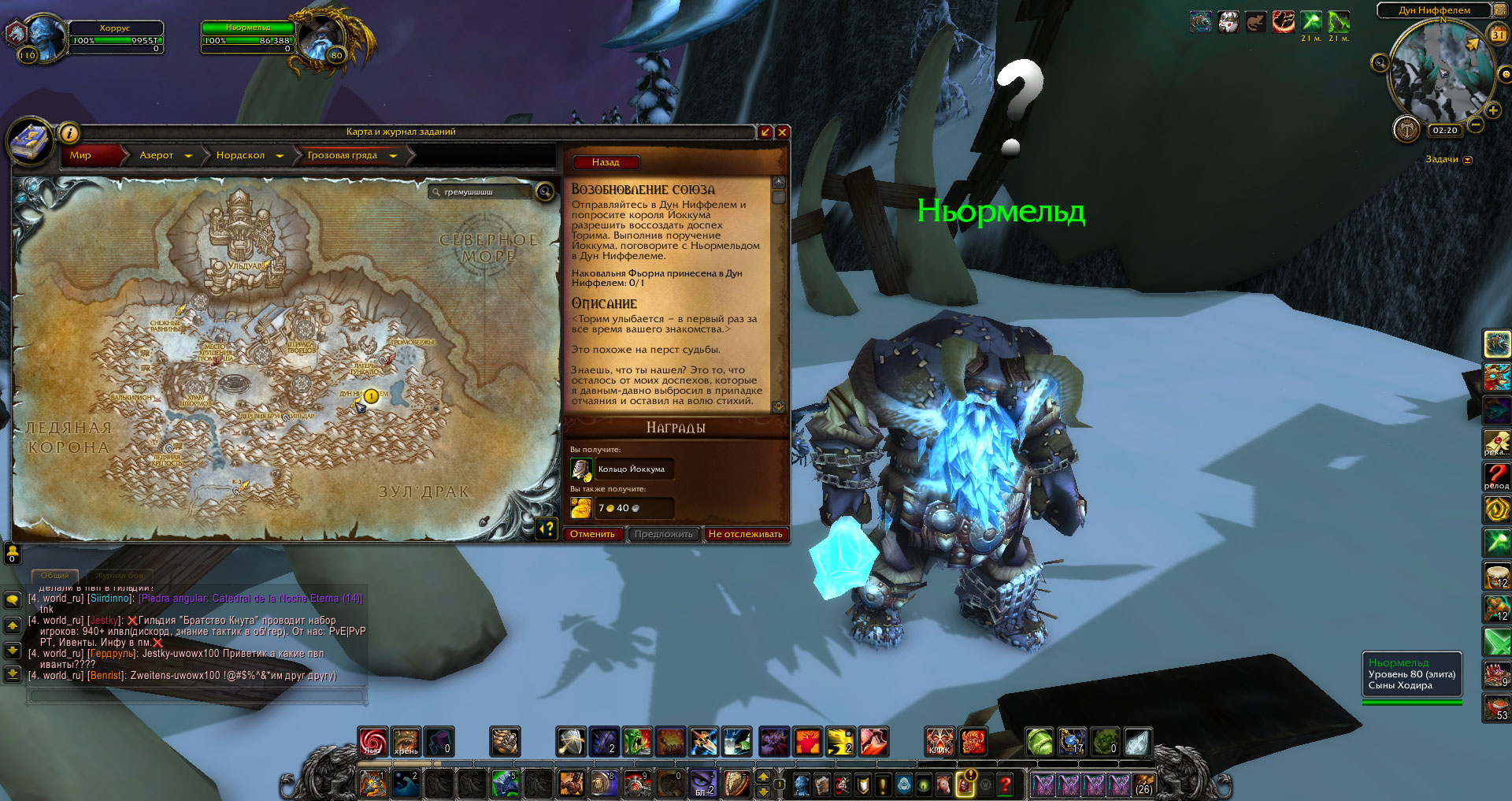 | Description | Добрый день. Столкнулся с такой проблемой - нет возможности сдать квест https://ru.wowhead.com/quest=12924/возобновление-союза нпс https://ru.wowhead.com/npc=30127/ньормельд#ends подсвечен серым знаком вопроса и не принимает квест, условия все выполнены; репутация с сынами Ходира превознесение , пройдены квесты от https://ru.wowhead.com/quest=12966/мимо-него-не-пройдешь до https://ru.wowhead.com/quest=13001/копье-ходира но квест https://ru.wowhead.com/quest=13009/новое-начало отсутствует у выше указанного нпс. | ||||