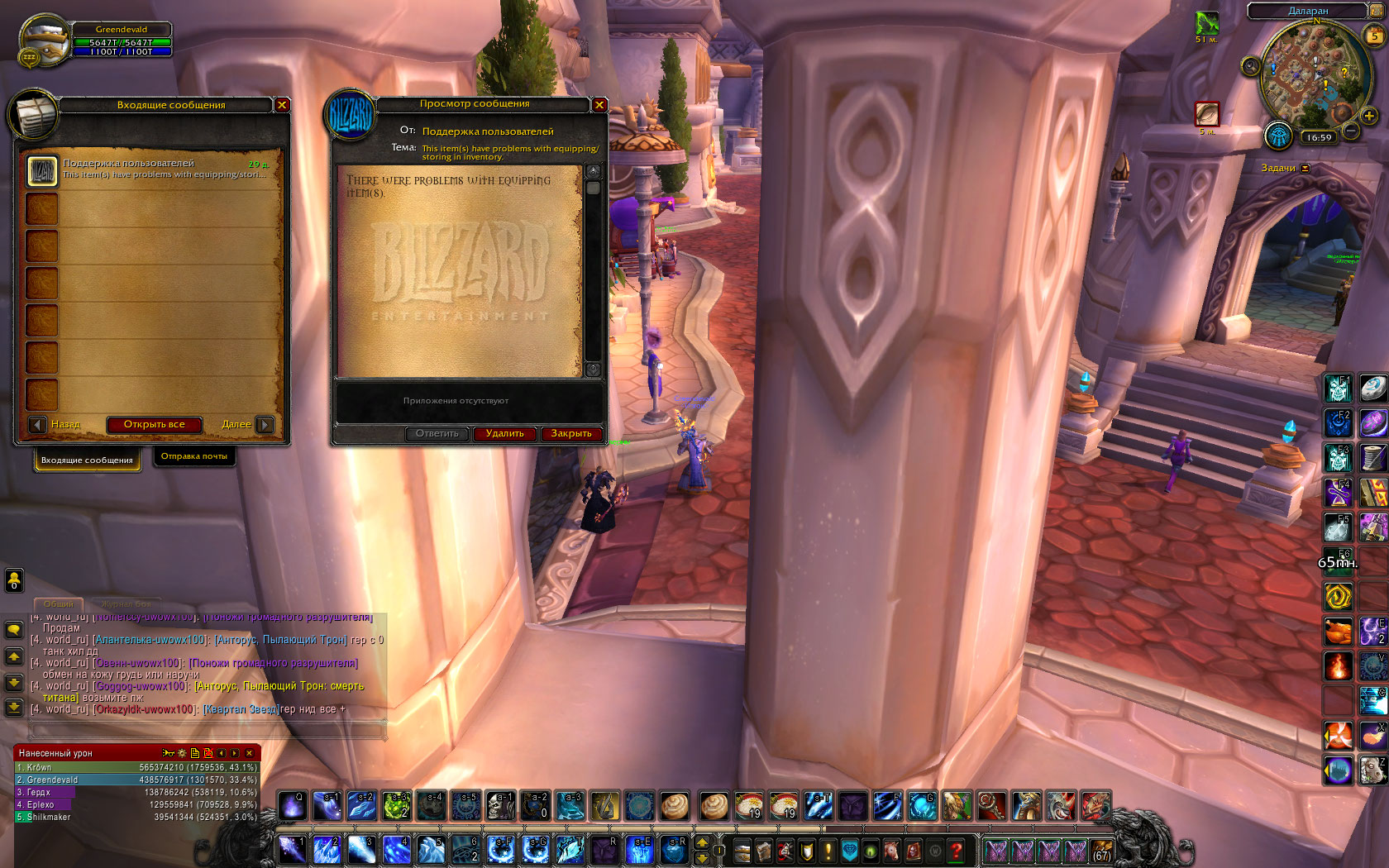| Description | Epicwow x1-x5 Орда, Нежить. учётная запись [email protected] Маг, ник в игре Greendevald. Специализация - Лёд, артефакт 75+уровня (почти 76) Регнул БГ ->> прошёл бг ->> вернулся в мир после бг ->> пропал артефакт. Пришло письмо №1 на почту автоматом с артой 0уровня с очками Силы Артефакта. Прокачал в оплоте заново, но силы артефакта хватило лишь до 67уровня. Пропало 8уровней. Пришло автоматическое письмо №2 на почту что проблема с 8уровнями артефакта. Прошу вернуть артефакту 75уровень, либо добавить очков для его прокачки. Фото до бага конечно нет, не ожидал такого подвоха... | ||||