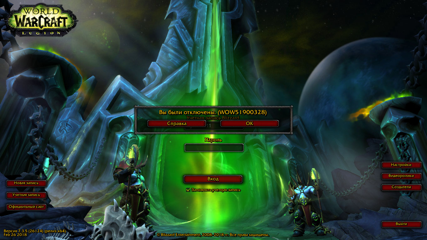 | Description | Немогу войти в игровой мир с аккаунта bigandron11!!!С января месяца выскакивает ошибка WOW51900328 после таблички "Вход в игровой мир" Всё что мог испробовал но никакого толка нет !!! на Аккаунте 14 персонажей ,выполнено достижение "Теперь вы готовы и открыты обе дружественные рассы !!! Помогите !!! Почему немогу войти в свой аккаун ,никаких блокировок и банов небыло??? | ||||