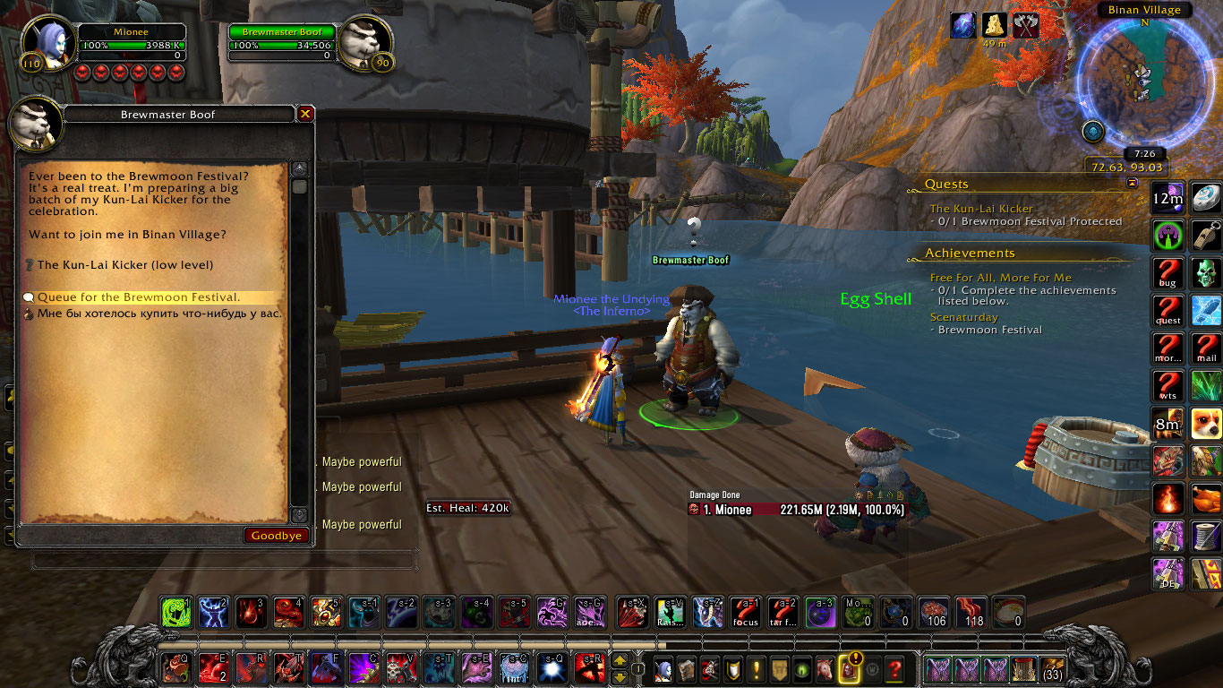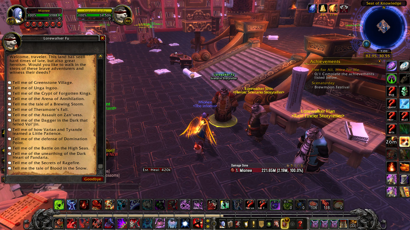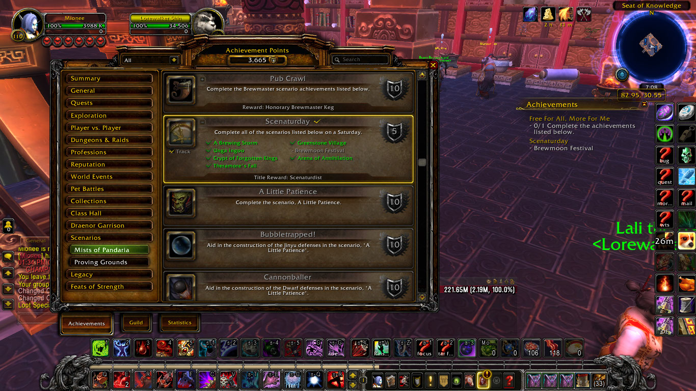 | Description | Brewmoon Festival is the only scenario that is not implemented and cannot be queued from the MoP Scenario NPC. It's part of the achievement Scenaturday and the only scenario that is not scripted, can we please fix this so we can get the title? :) https://www.wowhead.com/achievement=7509/scenaturday https://www.wowhead.com/zone=6426/brewmoon-festival#comments (There is also a quest which asks you to complete this scenario, the quest does not work too, you cannot queue for the scenario - https://www.wowhead.com/quest=31611/the-kun-lai-kicker) Proof: https://i.imgur.com/zi7RT6I.jpg https://i.imgur.com/Ny2uH2B.jpg https://i.imgur.com/wKeqZrE.jpg | ||||