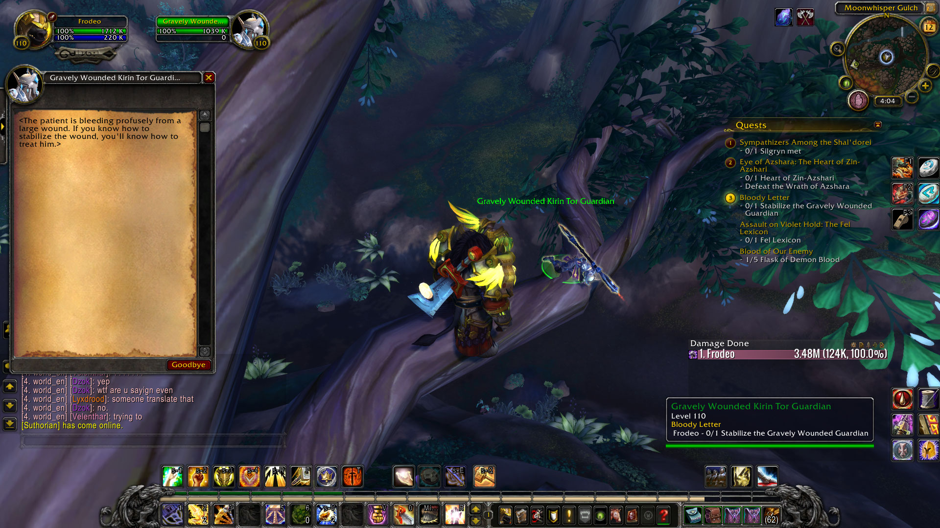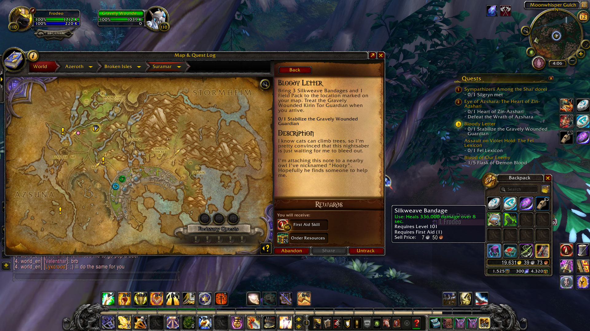 | Description | The quest "Bloody Letter" in Suramar is not doable , since even tho i have the required materials , when i talk with the "Gravely Wounded Kirin Tor Guardian" on the tree branch the option to help him doesn't come up which completely blocks the quest. | ||||