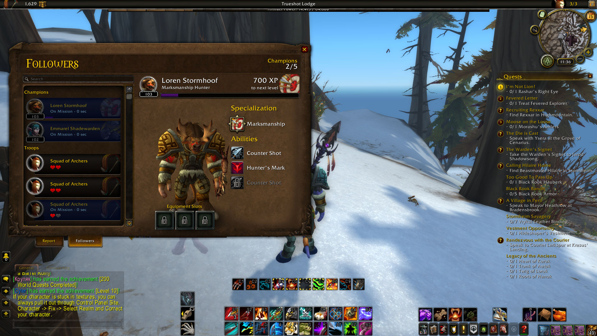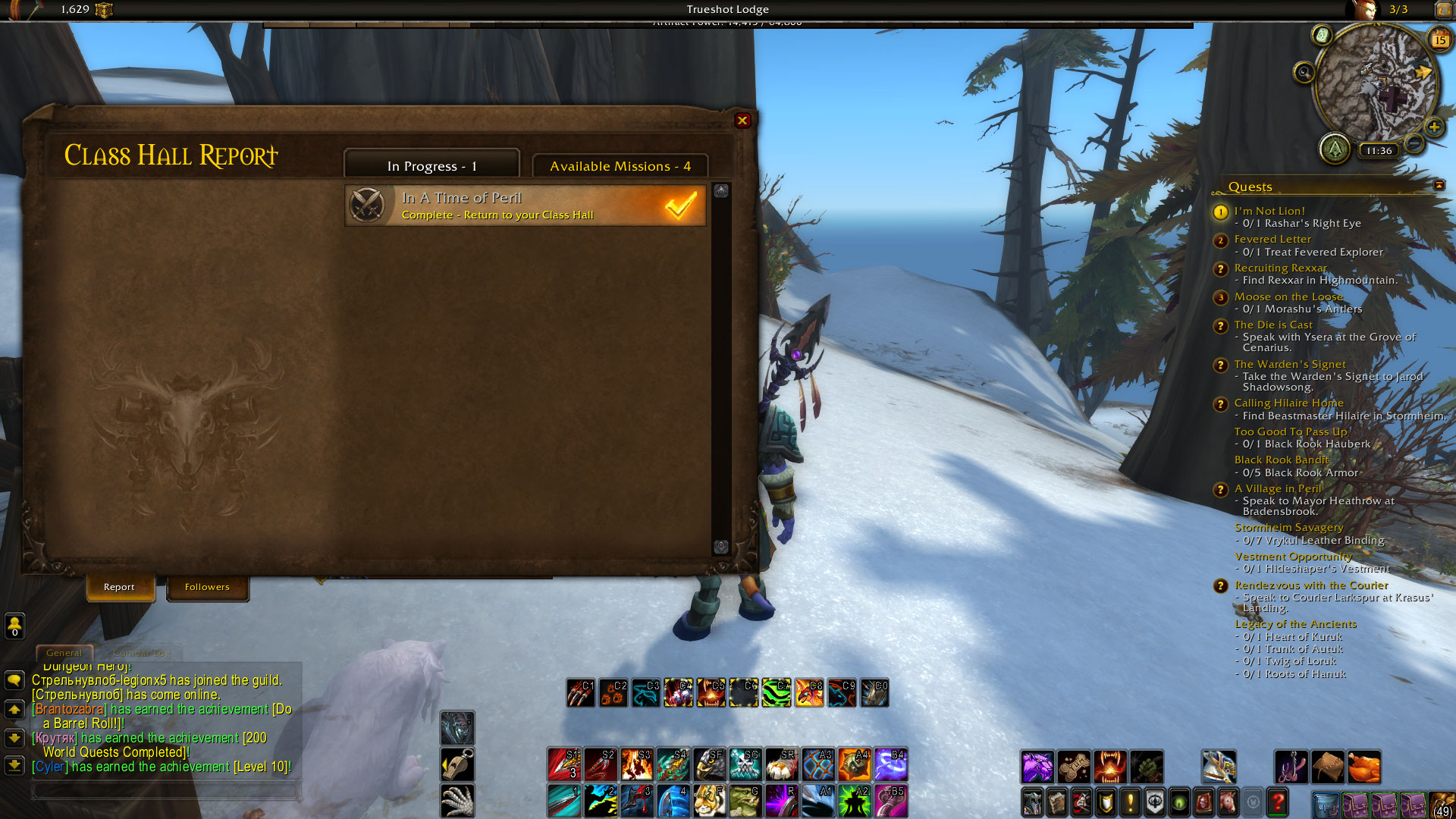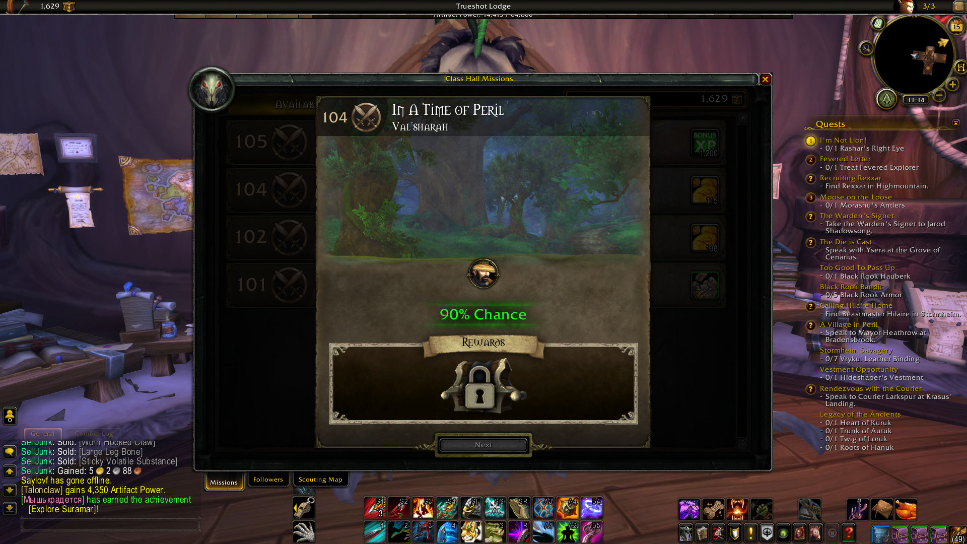 | Description | Hello, I have a problem with my hunter class order hall. It's about a follower mission called "In A Time of Peril". I sent my followers to do this mission a few days ago, but I can't complete it on my Scouting Map - the chest reward is locked and the "Next" button is greyed out. My followers are permanently stuck on this mission and I can't send them on new ones, which stops my order hall progression. Would you be able to help? I have also included an ingame screenshot, my ingame nick is "Electer". Thanks in advance! | ||||