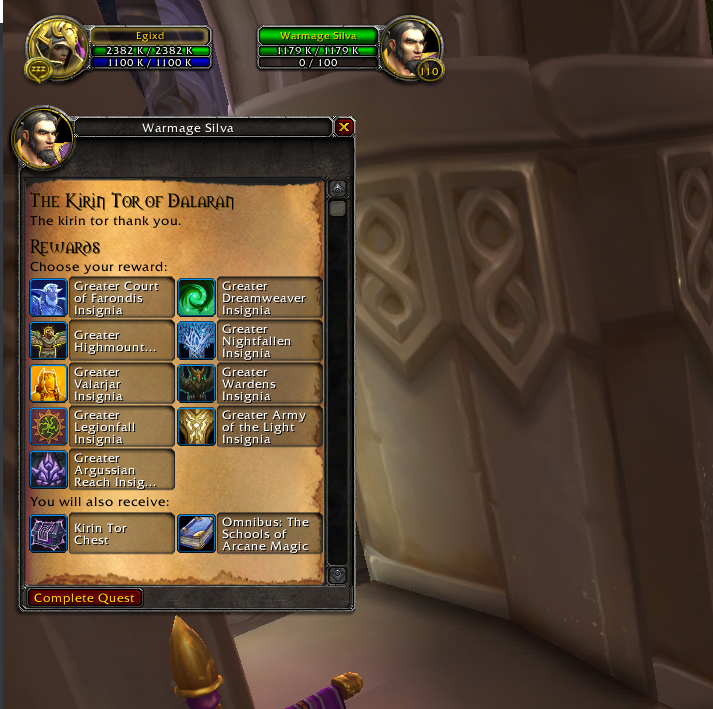 Kirintor is a faction from the Wrath of the Lich King expansion. For this reason, upon completion of an emissary mission, a choice of a token with the reputation of one of the Legion factions is given. You somehow constructed phrases in such a way that it is not clear what the problem is. You can't choose a token in the reward or don't get it after choosing, you don't get the expected reputation with the Kirintor faction? Or something else? Or do you think that the sequence of possibilities is violated (7.0.3, 7.2.0, 7.3.5) |