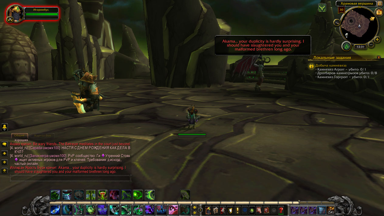 | Description | 1. Когда говорит с Акамой, уходит в угол 2. Во время фазы с духами, стоит на земле 3. После фазы с двумя духами клинка аззинота, Иллидан постоянно стаётся в воздухе. Его никак не сбить и не атаковать. + Он наносит урон в ближнем бою будучи в воздухе. 4. Сам Акама убегает за закрытые ворота и не может попасть назад. 5. Отсутствует фаза где Иллидан использует облик демона 6. В случае победы над ним, вход остается закрытым. | ||||