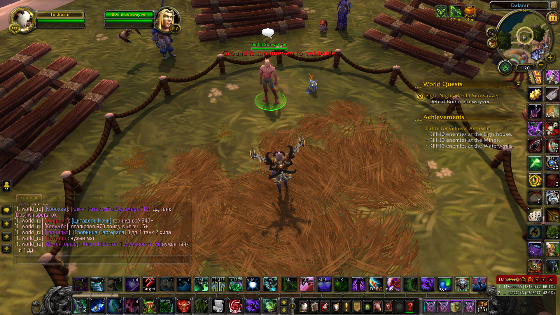| Description | No matter at what spot i try i can't start the battle for https://www.wowhead.com/quest=40299/fight-night-bodhi-sunwayver. I always get the "Ground is too uneven to pet battle". there is something wrong with the location there. If you are fixing it please check out https://www.wowhead.com/quest=42442/fight-night-amalia, https://www.wowhead.com/quest=40277/fight-night-tiffany-nelson and https://www.wowhead.com/quest=40298/fight-night-sir-galveston since they spawn on the same location. I have not tried them personally but probably the have the same problem. | ||||