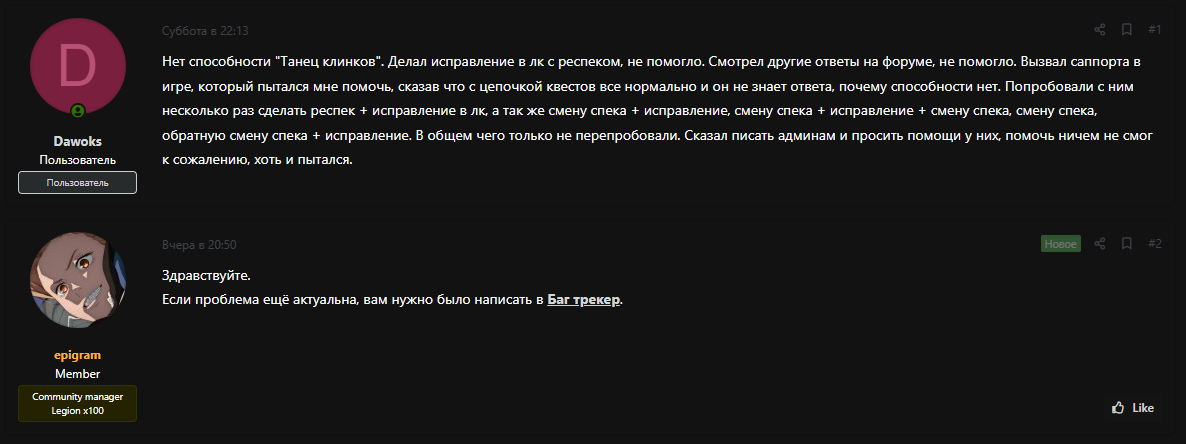 Доброго времени суток, прошу прощения за отсутствие, тему упустил, скажите мне свой игровой никнейм. Опишите еще раз подробнее какие методы починки вы пробовали сделать на персонаже Когда пропал спел? возможно у вас есть предположения из-за чего он вообще пропал? |