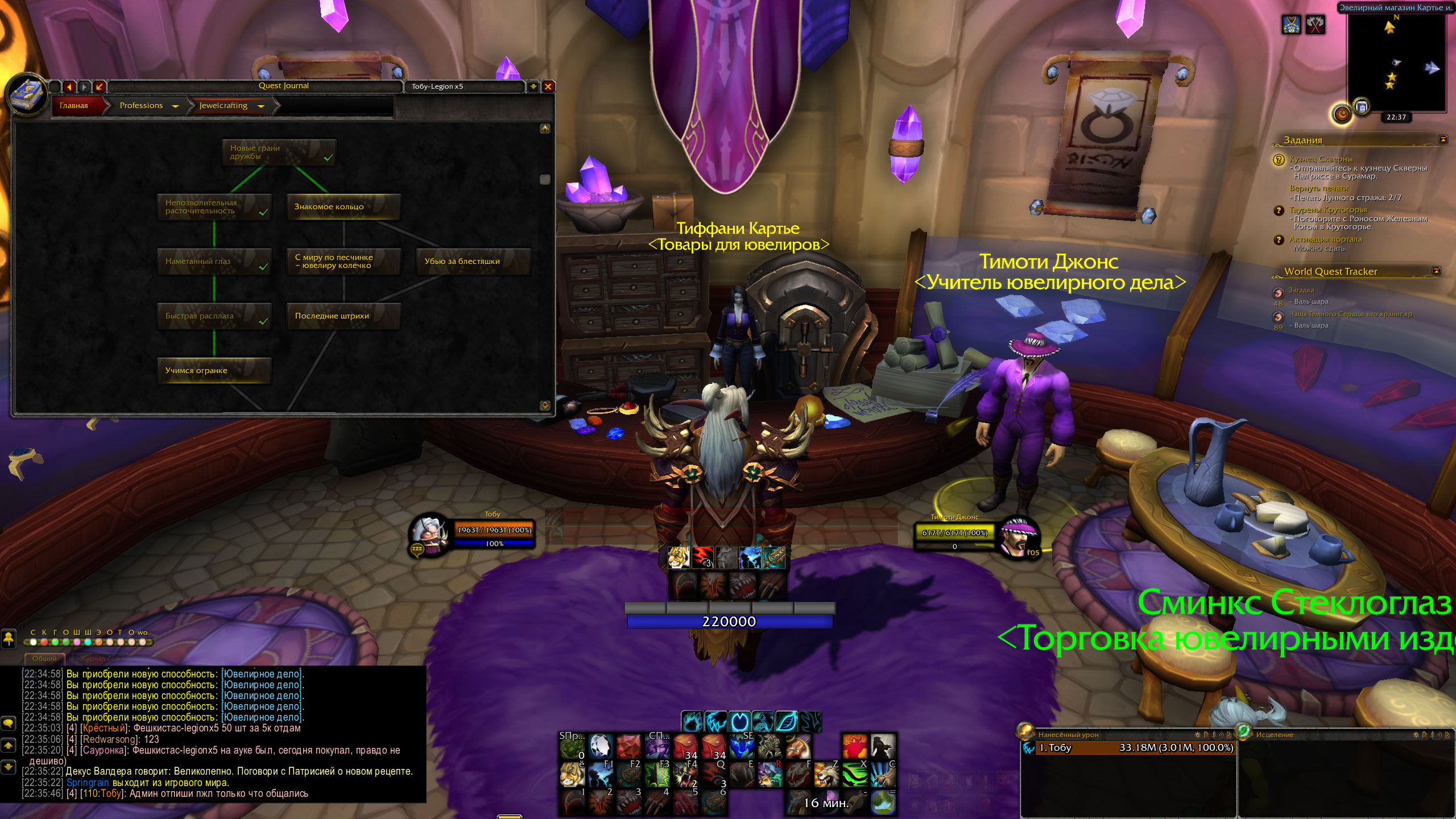 | Description | Добрый день. Начал проходить цепочку квестов на Ювелирное дело, в итоге после прохождения квеста "Быстрая расплата" (quest=40531) у меня всё забаголось. Квестов больше не дают. Профа не качается. Вдобавок я отменил знания Ювелирного дела (дамал поможет) купил книжку за 1000 золота Забытые эскизы Расколотых островов (item=139497), но она вообще никак нечего не востановила и теперь у меня знания Ювелирного дела вообще нуль... Я в ужасе... Очень прошу помочь. Скриншот прилагаю. Нужно будет ещё сделаю. | ||||