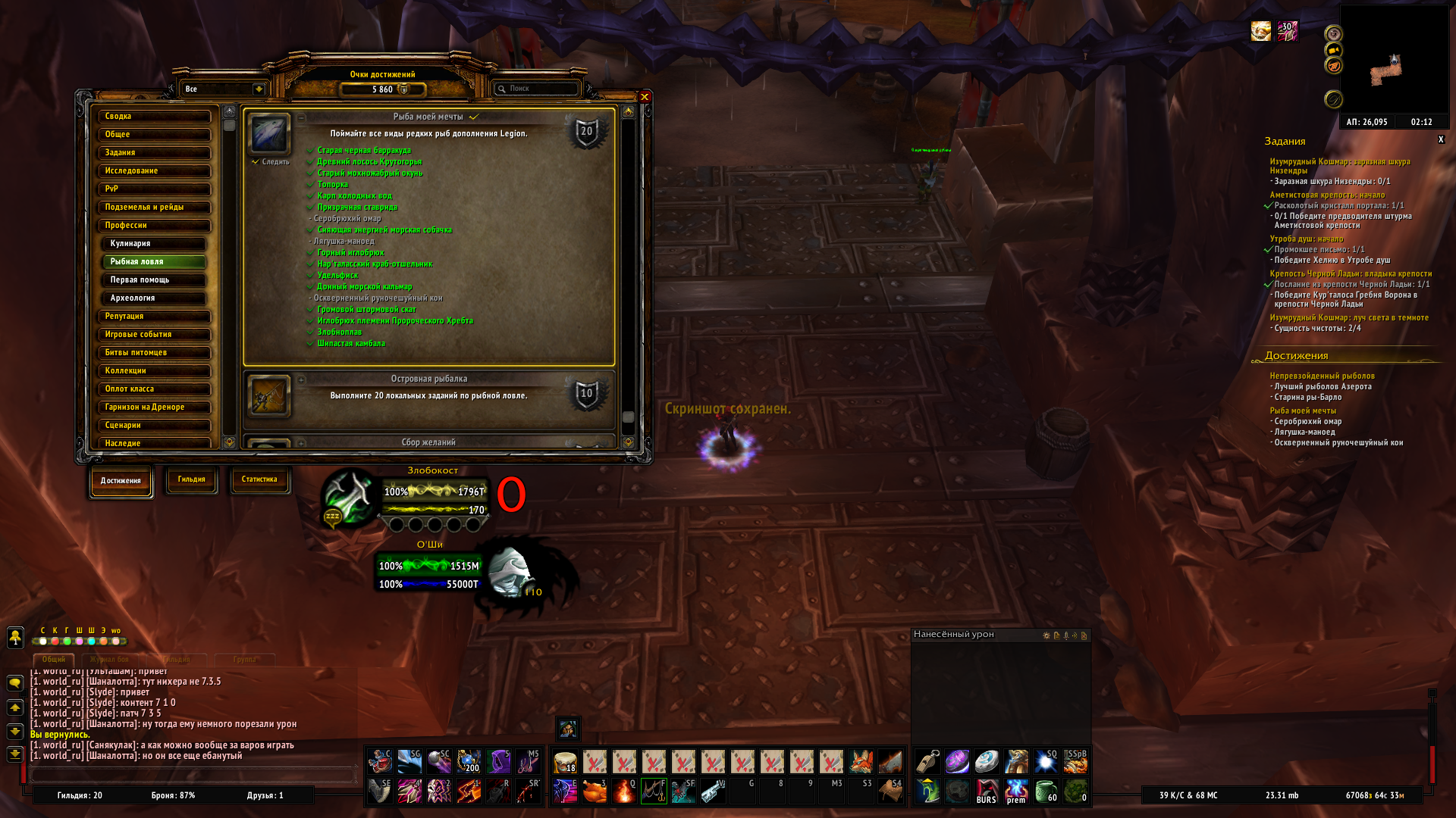 | Description | https://ru.wowhead.com/achievement=10596/%D1%80%D1%8B%D0%B1%D0%B0-%D0%BC%D0%BE%D0%B5%D0%B9-%D0%BC%D0%B5%D1%87%D1%82%D1%8B#comments Данное достижение необходимо для получения легендарной удочки.Столкнулся с проблемой что оставшиеся 3 рыбы,никак не хотят дропаться,наживки использую,навык 900+,суммарно было потрачено около 6 часов (1к+ бросков) нудного фарма в пустую,ловил как в лунках так и просто в водоемах (разницы 0).Прошу проверить % дропа и возможность дропа данных рыб. | ||||