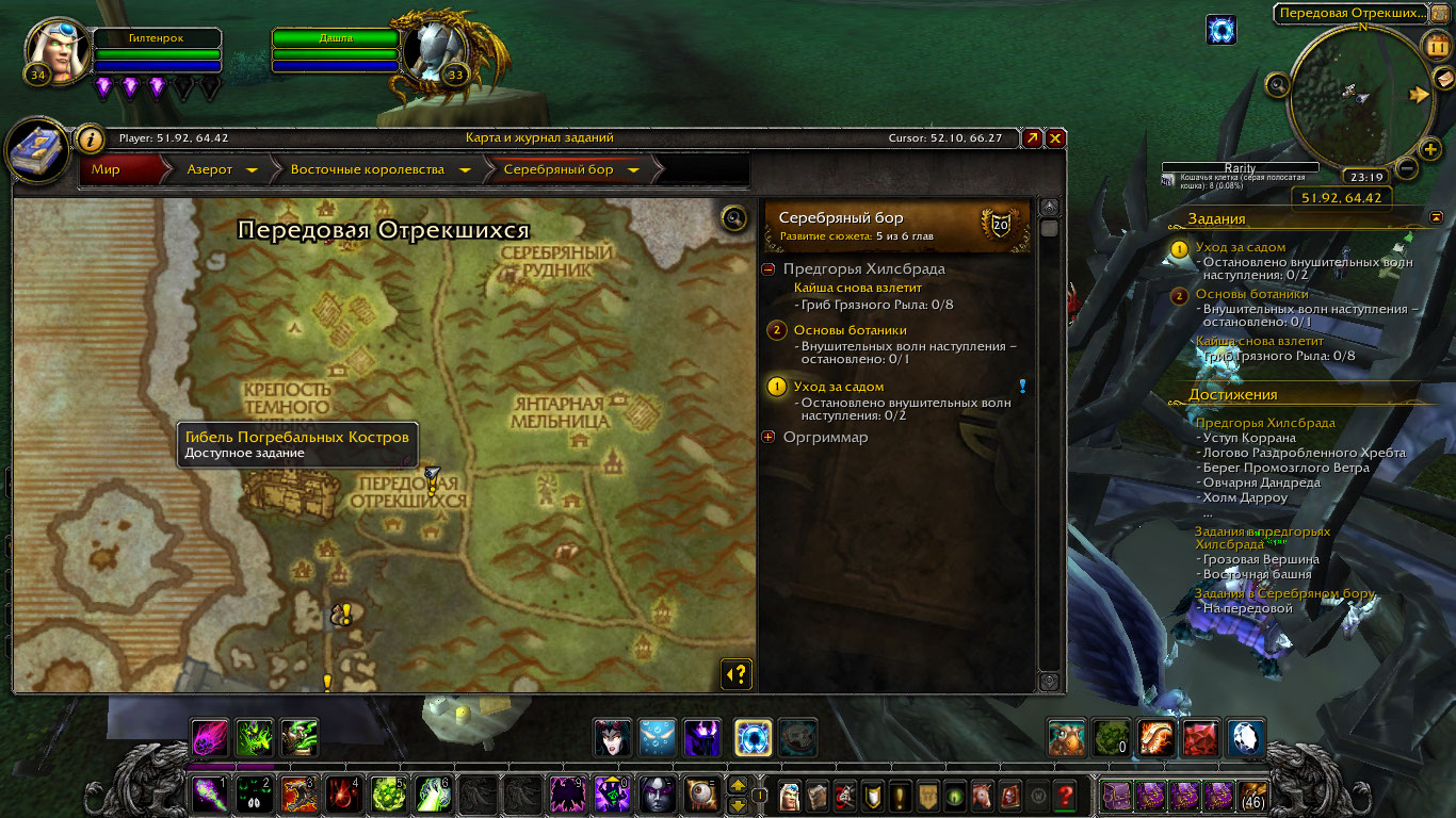 | Additional Information | Скриншоты.... Показывается на карте, что квест еще не сделан или цепочка к нему. Кв https://ru.wowhead.com/quest=27550/гибель-погребальных-костров Возможно он должен идти после сдачи https://ru.wowhead.com/quest=27518/война-миров-глава-iii ? Я и Дашла. У который должны появиться кв нипы, дающие следующие 3 кв по wowhead -любуемся друг на друга минут 10-15. Нпс не приходят. | ||||