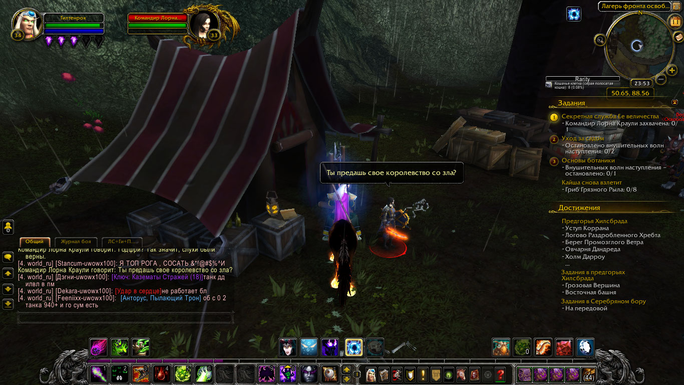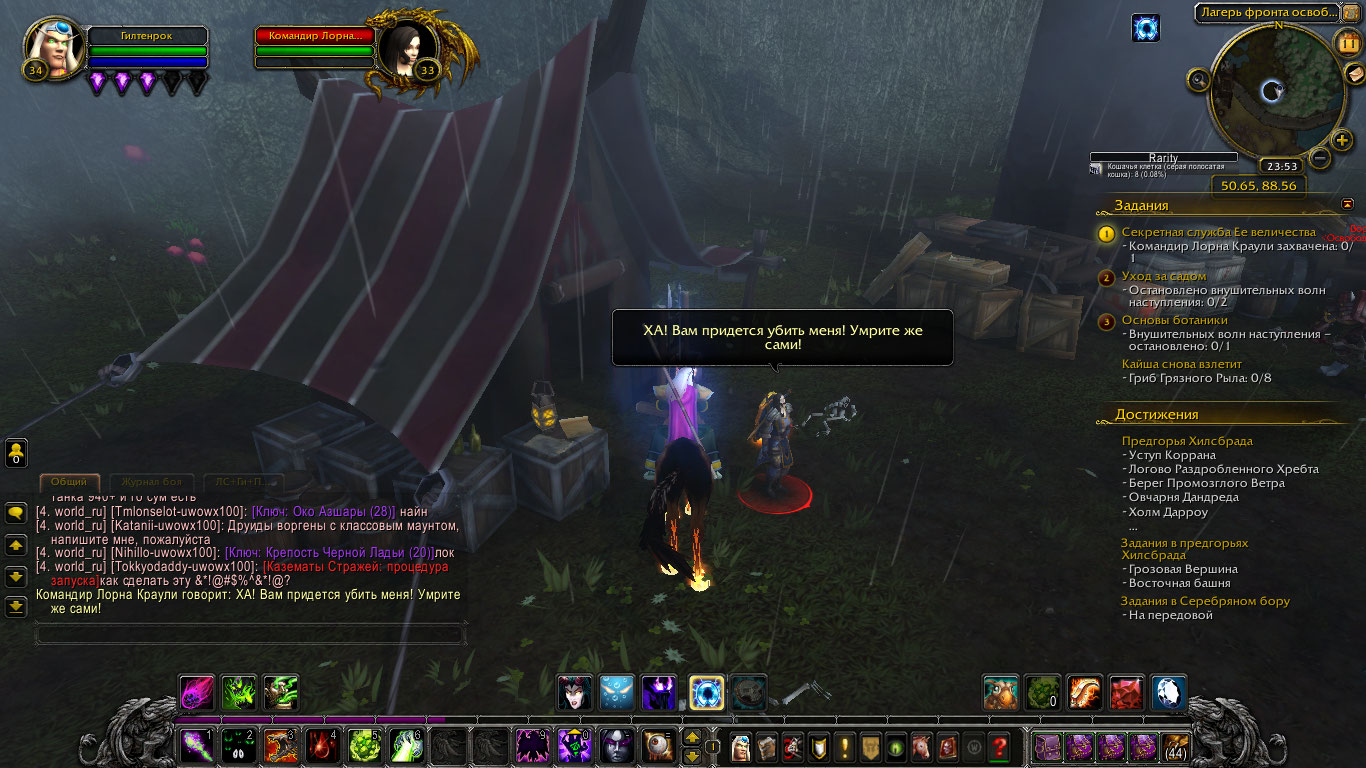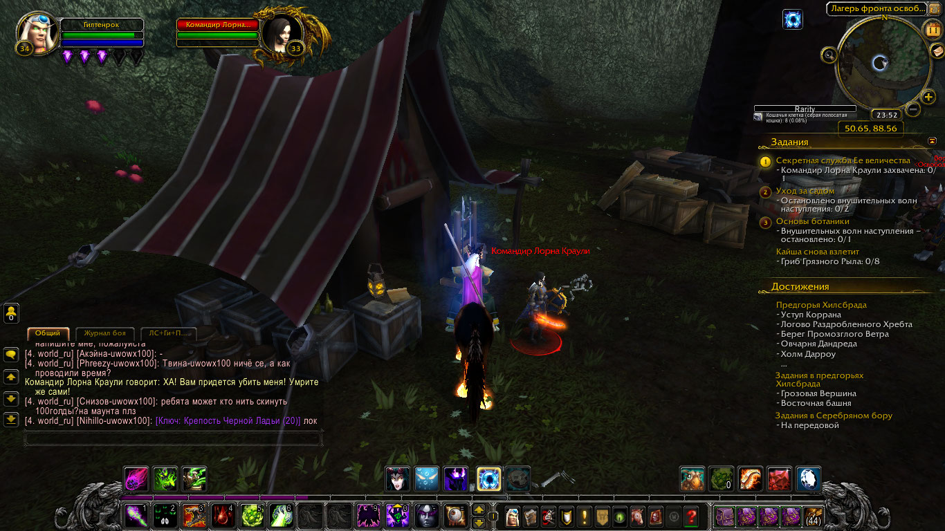 Так я не знаю почему....Но на сервере будто бы...все работает не совсем в том порядке как на wowhead. И странно отображает игра квесты на карте криво (я нашла кв посмотрев где он еще раз по аддону Quest Complist, он отображает где искать квест корректнее) ...Как выше видно https://ru.wowhead.com/quest=27550/гибель-погребальных-костров Отображало не там где я его нашла по итогу. Он не на передовой, а в деревне у Руин Гилнеаса.... Кстати, увы и эта цепочка багнута...Она закончилась у меня на квесте https://ru.wowhead.com/quest=27594/секретная-служба-ее-величества Проблема в нпс Лорна Краули, которую мы должны взять в плен (не активна для убийства) не береться в плен и говорит с воздухом 4 строчки диалога: 1-Так королева баньши послала убийц? 2-Годфри, так слухи верны? 3-Ты предаешь свое королевство злу? 4-Ха вам предеться меня убить! Умрите же сами! Почему я так описываю? Все говориться с задержкой. Видимо со мной должны быть нпс и они должны отвечать. Но при двух попытках отменить-взять кв заново Годфри и Эшли со мной не идут... По итогу Лорни говорит сама с собой и после фразы 4, повторяет диалог еще раз и еще...до бесконечности квест нереально завершить....Скрины с ее монологом прилагаю... Квест точно сломан или забагован по кругу. Выполнить цепочку опять невозможно без фиксов в бору. |