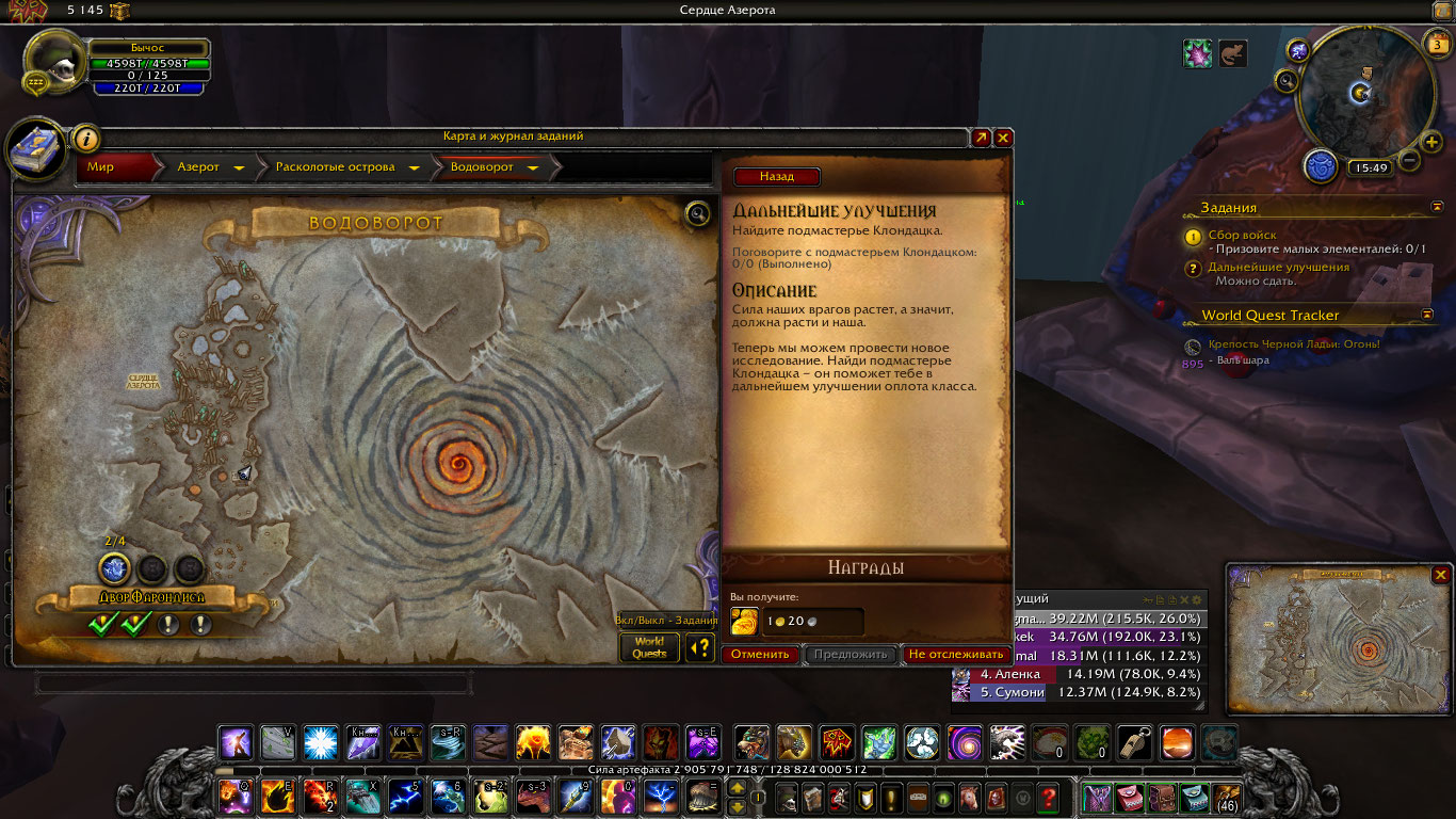 | Description | Старый персонаж и все артефакты получены до реализации кв, решил открыть себе слот под второй арт и заметил что нет нпс https://ru.wowhead.com/npc=112199/подмастерье-клондацк#objective-of который даст эту возможность. Сделал квест на арт, и последующие квесты для открытия данного нпс без проблем, но заключительный квест для данного нпс у меня сломан https://ru.wowhead.com/quest=46781/дальнейшие-улучшения беру квест а нпс нет, просто не кому сдавать | ||||