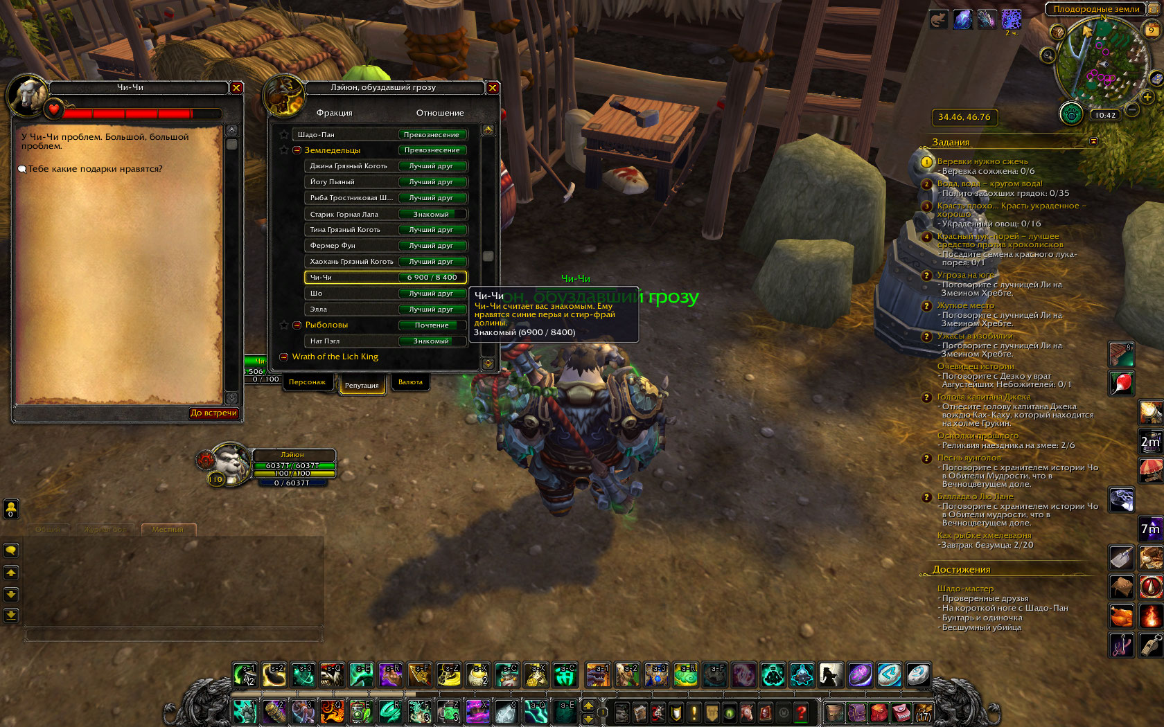 | Description | Отсутствуют дейли-квесты у https://ru.wowhead.com/npc=58709/чи-чи на сдачу https://ru.wowhead.com/item=79265/синее-перо (https://ru.wowhead.com/quest=30400/синее-перо-для-чи-чи), хотя само перо в сумке присутствует. Согласно Wowhead, этот квест должен быть доступен до тех пор, пока персонаж не повысит репутацию с https://ru.wowhead.com/npc=58709/чи-чи до "Лучший друг", после чего должна начаться цепочка квестов https://ru.wowhead.com/quest=31338/заблудший-барашек. Такая же проблема имеется со https://ru.wowhead.com/faction=1276/старик-горная-лапа и https://ru.wowhead.com/quest=30394/синее-перо-для-старика-горной-лапы. Их репутация необходима для достижения https://ru.wowhead.com/achievement=6552/друзья-с-фермы. | ||||