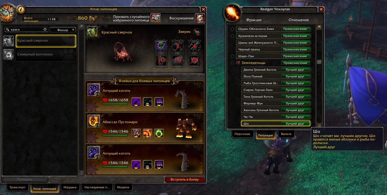 | Description | Здравствуйте, после получения репутации максимальной репутации с https://ru.wowhead.com/faction=1278/шо не пришел питомец https://ru.wowhead.com/item=85222/красный-сверчок#comments (Скрины). Может можно добавить данного пета дебагеру? | ||||