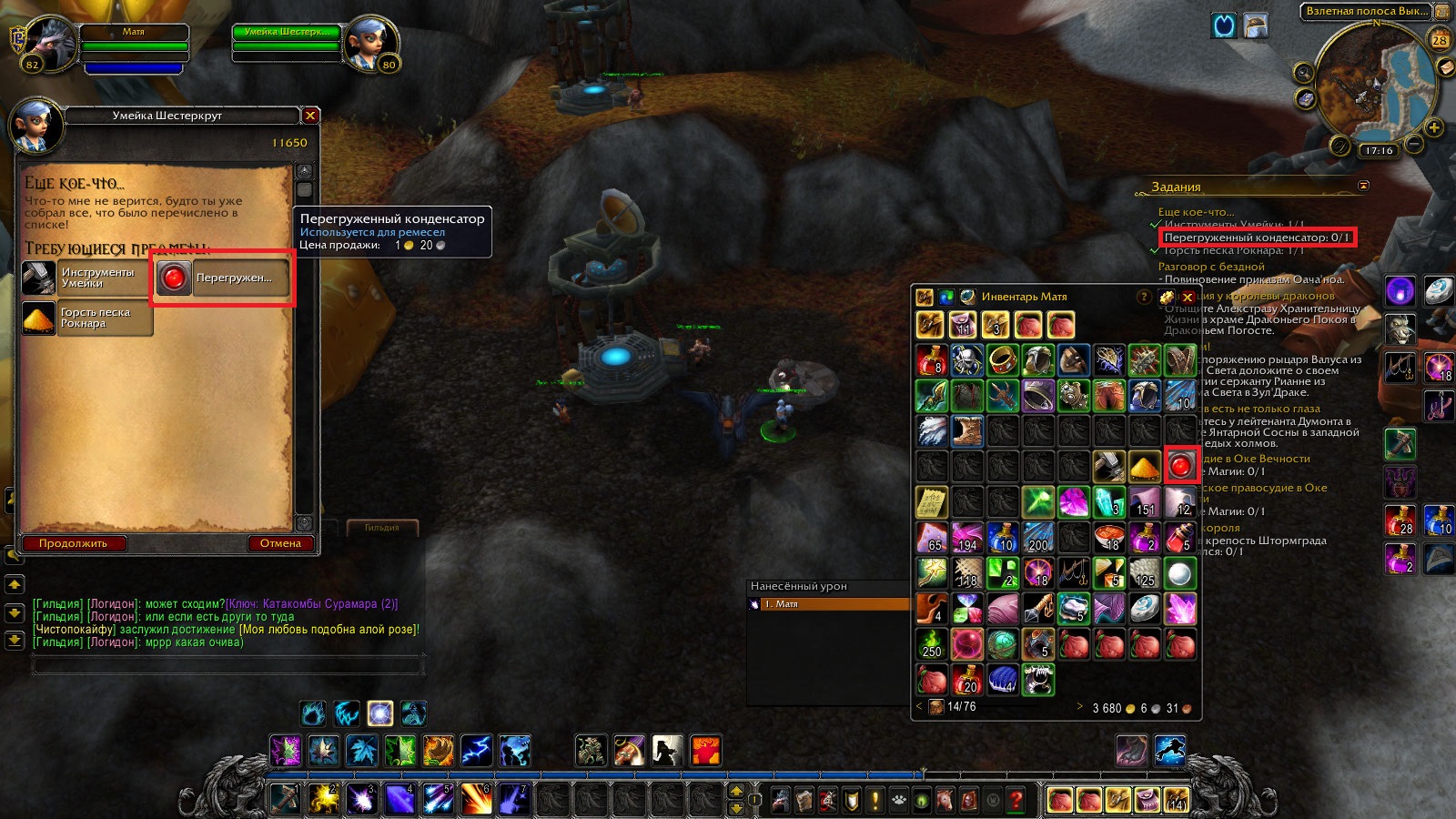 | Steps To Reproduce | Взять квест, собрать основные квестовые итемы("Инструменты умейки" и "горсть песка Рокнара"), купить или скрафтить, или выбить "Перегруженный конденсатор", попробовать сдать. К результату не приведет. | ||||