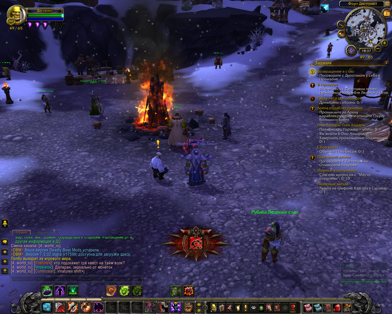 | Description | Здравствуйте. На данный момент решился выполнить первопроходца дренора и начал выполнять цепочки заданий в Хребте ледяного огня. Выполняя цепочку заданий столкнулся с проблемой, для завершения цепочек квестов мне необходимо выполнить квесты "Возвращение в стаю" и "В гарнизон", однако выполнить я их не могу, т.к. необходимо поговорить с Дуротаном в гарнизоне, а в гарнизоне то его нет. Прошу помочь мне с данной проблемой т.к. очень хочется исследовать дренор и квесты в нём. Это мой первый опыт в данных локациях. Данные квесты выполняю на персонаже под ником Дисттрикт. | ||||