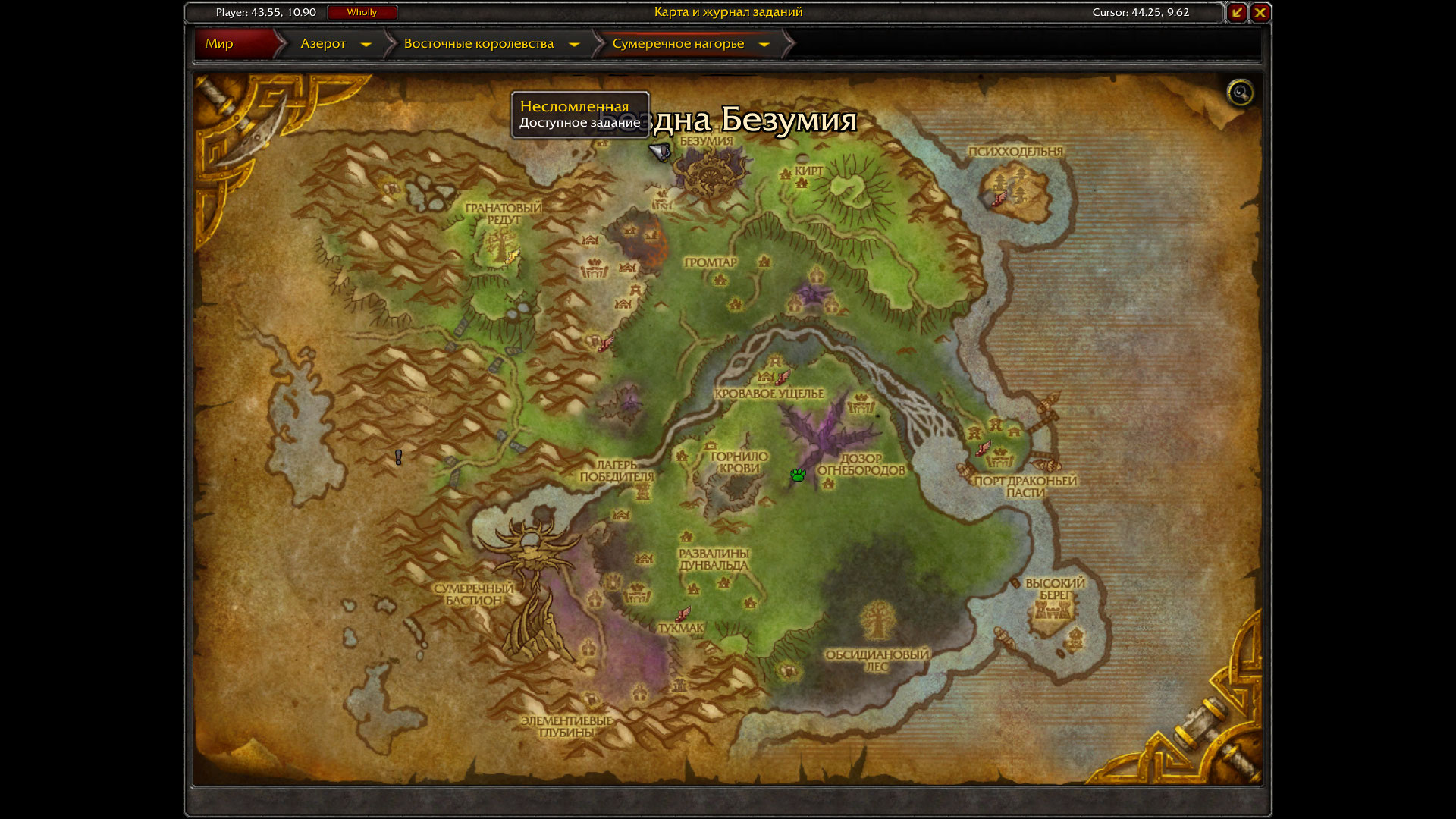 | Description | Не возможно взять квест https://ru.wowhead.com/quest=27301/%D0%BD%D0%B5%D1%81%D0%BB%D0%BE%D0%BC%D0%BB%D0%B5%D0%BD%D0%BD%D0%B0%D1%8F, так как отсутствуем НПС https://ru.wowhead.com/npc=45391/%D1%86%D0%B5%D0%BB%D0%B8%D1%82%D0%B5%D0%BB%D1%8C-%D0%B7%D0%B5%D0%BC%D0%BB%D0%B8-%D0%B4%D1%83%D0%B0%D1%80%D0%BD. | ||||