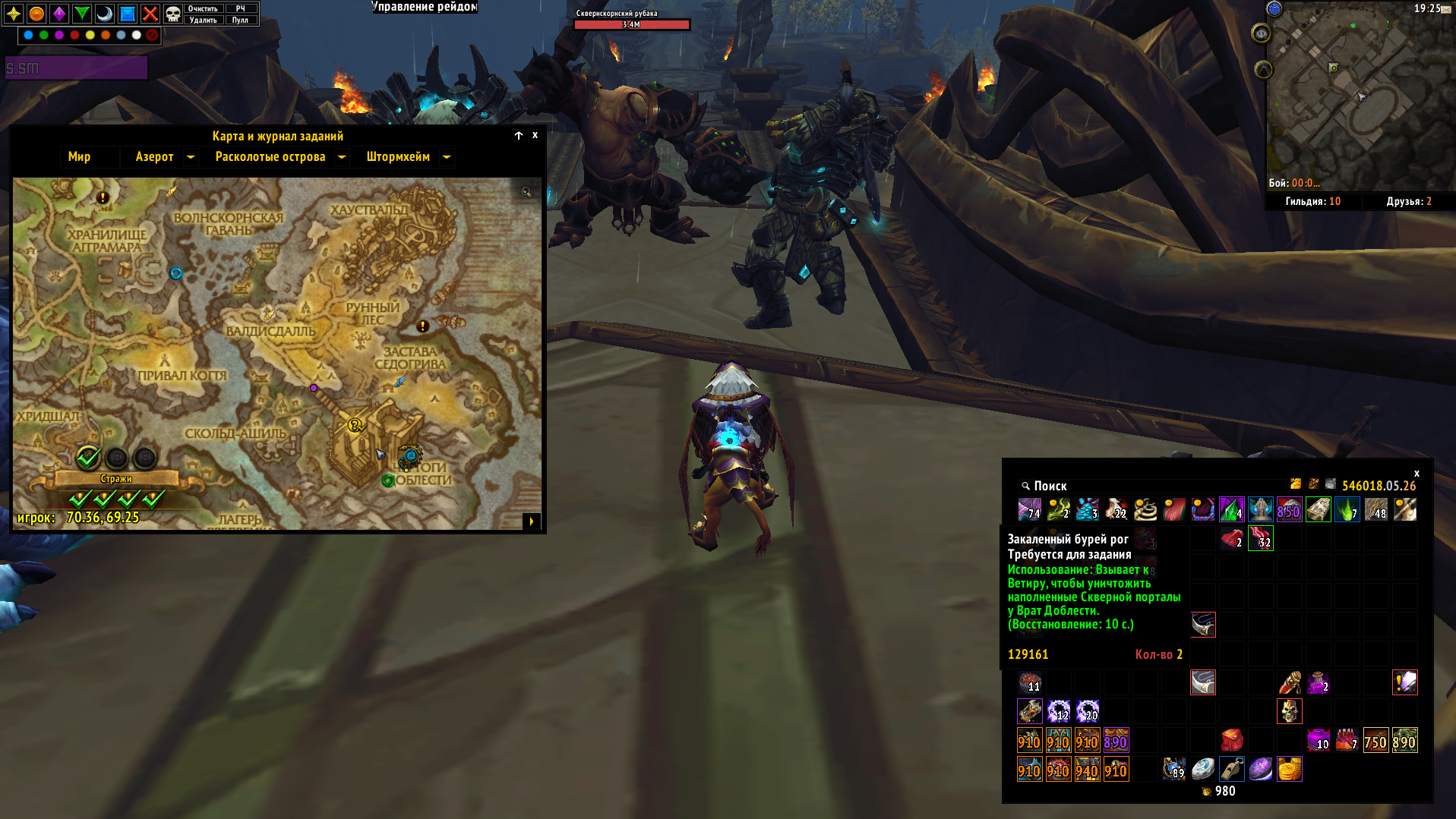 | Description | задание - https://ru.wowhead.com/quest=43827/%D0%BF%D0%BE%D1%80%D1%82%D0%B0%D0%BB%D1%8B-%D1%88%D1%82%D0%BE%D1%80%D0%BC%D0%BE%D0%BA%D1%80%D1%8B%D0%BB%D0%BE%D0%B2 при посещении "зоны квеста" выдают "рог" в инвентарь, чтобы сломать порталы, если во время выполнения задания в зоне перезайти на персонажа - то добавят еще один рог, и еще один, я "нафармил" себе 3 рога, но я уверен что можно сделать еще. повторил баг на обоих персонажах. | ||||