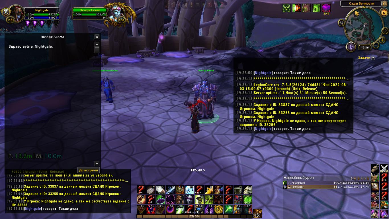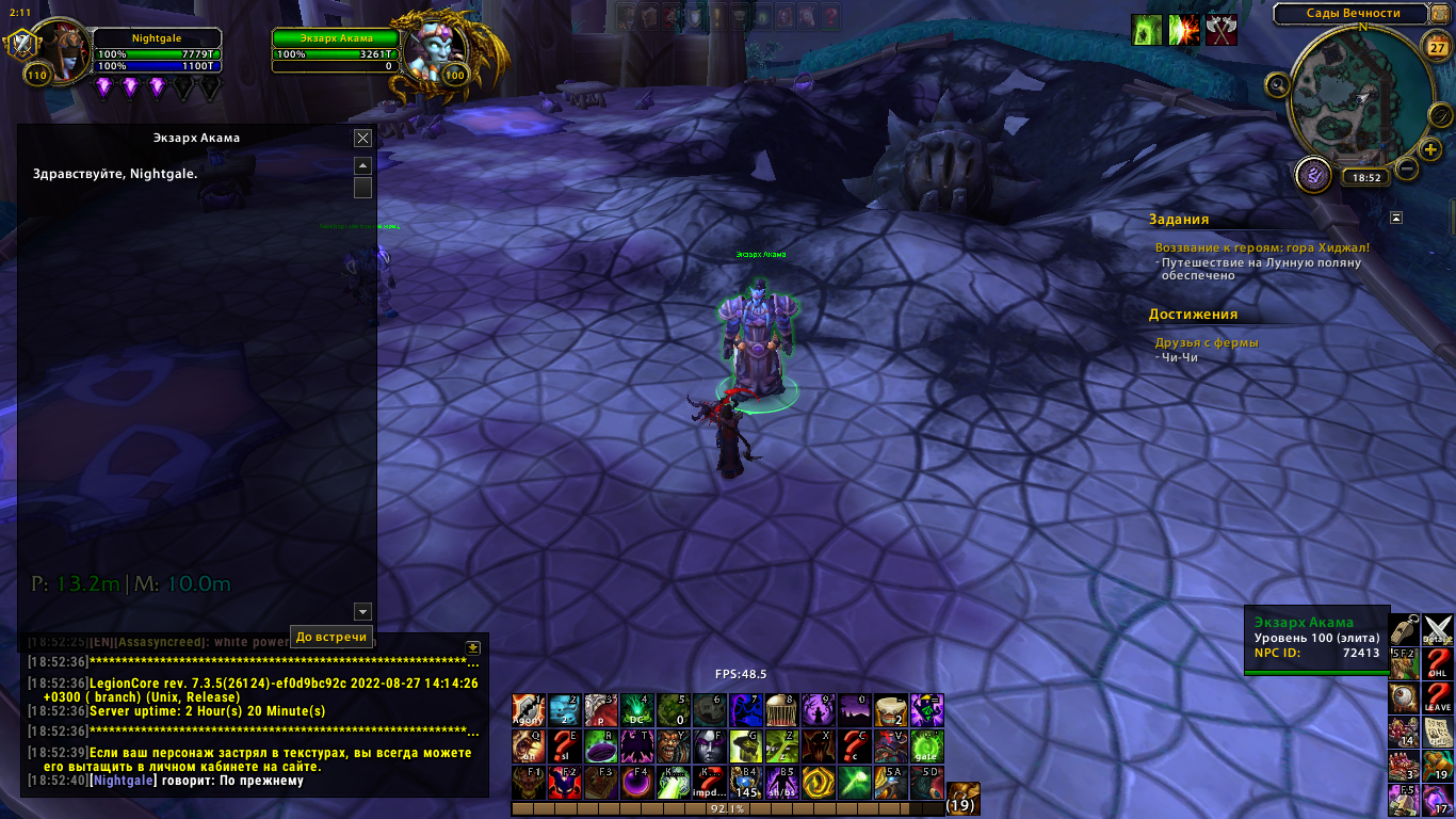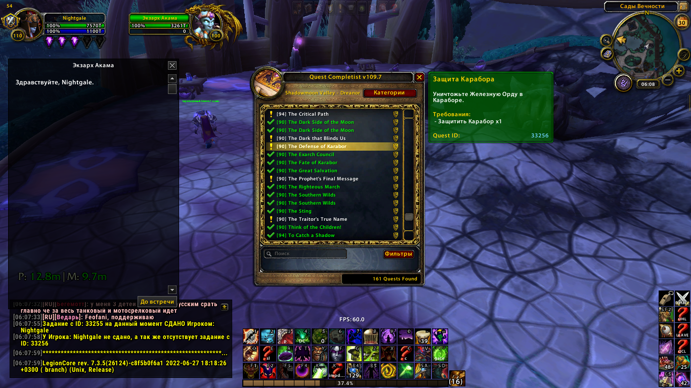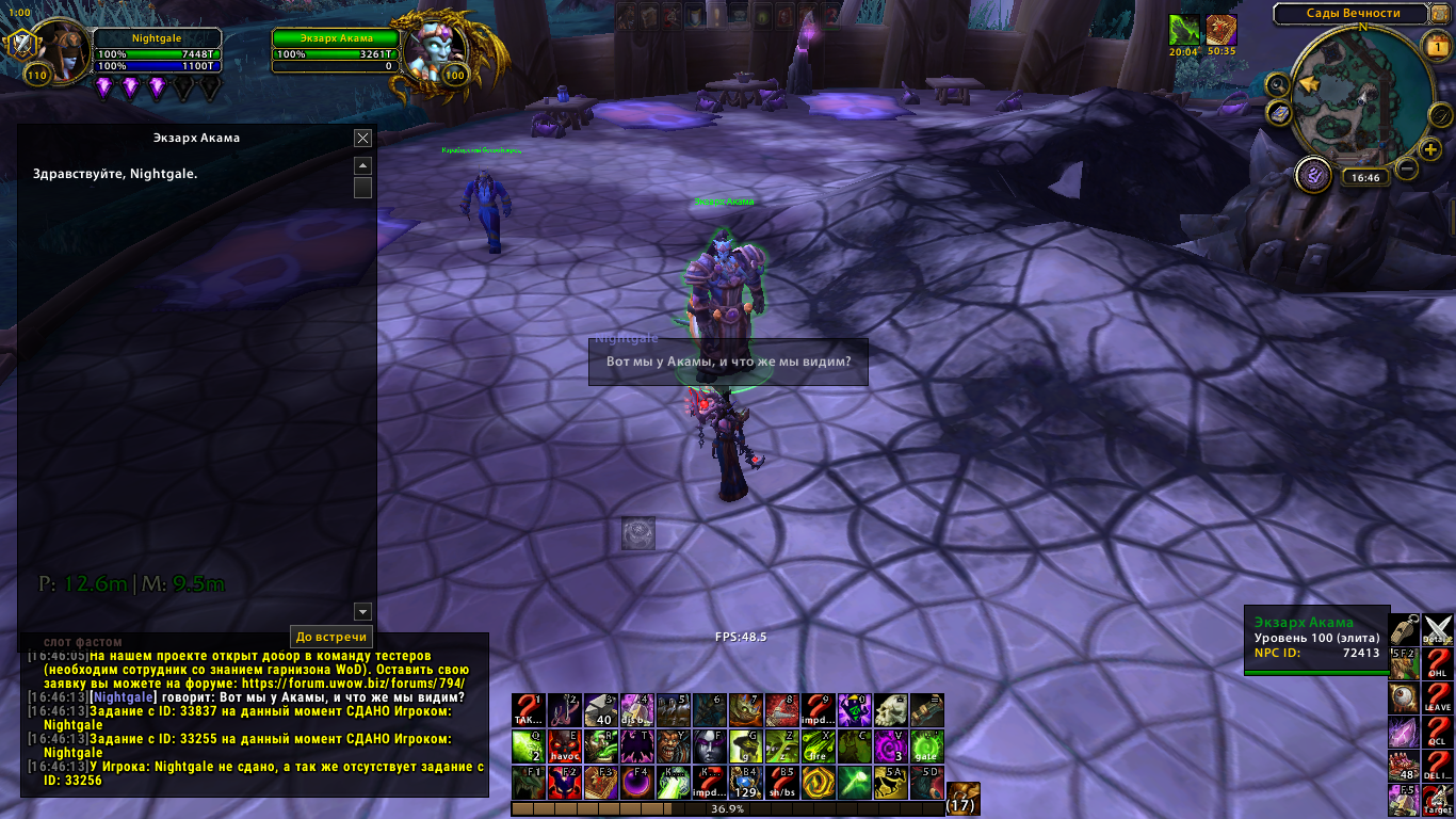 Квест все еще принимается у Акамы. Сверяться с Вашим аддоном никто не будет, за их работу мы не отвечаем. Предоставьте пожалуйста видео, на котором будет видно использование команд: .q s 33837 .q s 33255 .q s 33256 А также отсутствие квеста у Акамы в садах вечности (Карабор), при условии, что данный квест отсутствует и у Вас. |