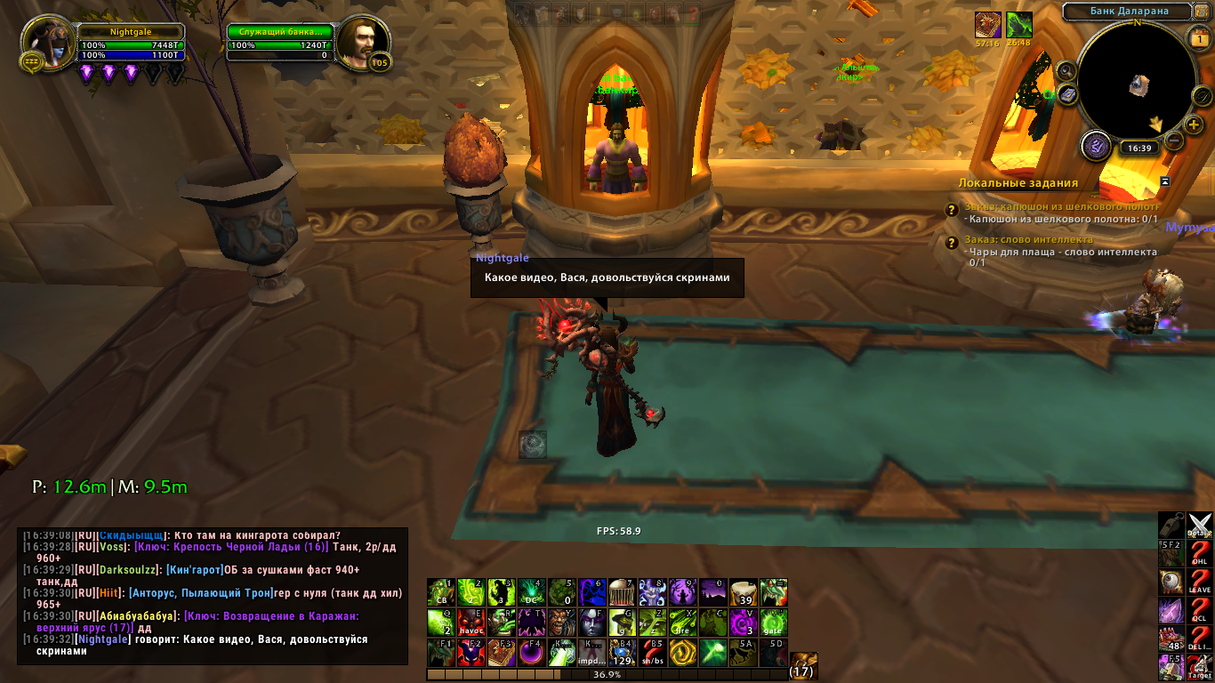 >В теме указанной как дубль есть приватный комментарий для разработчика, который Вы не можете посмотреть. Из-за чего я думаю что на меня забили хрен, и закрыли репорт, хотя проблема есть. Гениально. >Старайтесь пожалуйста впредь разговаривать вежливее, в противном случае Вы можете получить блокировку на данном ресурсе от его администрации. Это хоть и довольно душно, но абсолютно в пределах приличия, будь бы я асторатом, ты бы из душа не вылезал, пытаясь отмыть те помои, которые на тебя вылили. На Юру я с репортом по локалке с ареной у кчл-а я гнал куда сильее, когда он просто стирал комменты без обратной связи, и только через несколько часов стал перепиливать репорт, добавляя туда данные. >Сдал квест Марш справедливости Принял Защита Карабора и покинул сценарий. После отменил квест и взял его там же, где взял его в первый раз https://egammi.net/image/S2Mu Ну я же не ретард, я стою точно там же, преквест у меня так же выполнен, но вот беда, квеста у дубля акамы нет, такие дела. Я даже перезасчитывал все выполненные квесты в шедоумуне у дебагера с помощью квесткмполитлиста и приведённого ниже скрипта, перед тем как создавать самый первый репорт. function uwow_recomplete() local lineN = qcQuestInformationTooltip:NumLines() local lineT = _G["qcQuestInformationTooltipTextRight"..lineN] local questID = gsub(tostring(lineT:GetText()),".cFF69CCF0","") --print(questID) GossipTitleButton1:Click() StaticPopup1EditBox:SetText(questID) StaticPopup1Button1:Click() end На скрине видно сегодняшнюю дату, статус обоих квестов, а так же текущую ревизию, которая предполагает что правки недельной давности на нём, по идее, должны стоять. |