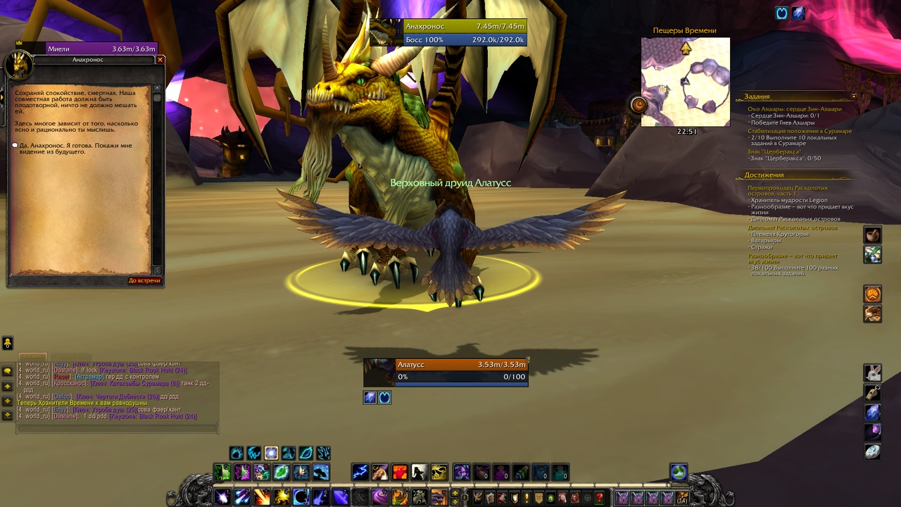 | Description | Вчера отправилась делать квест на легендарный посох Гнев Дракона, пришла к нпс в штормграде Корридорми, затем меня отправили в Пещеры времени где я должна была сдать и получить следующий квест у нпс Анахроноса, но заглянуть в будущее не работает ( разговор с нпс вызывающий ролик), и вневременное око квест так и не появился. | ||||