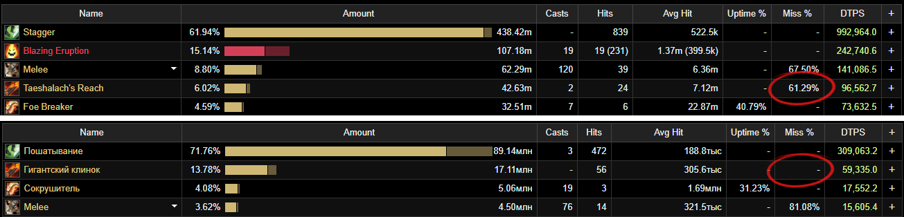 | Description | Дополнительная атака от https://ru.wowhead.com/spell=243431 должна доджиться, у нас попадает с вероятностью 100% Очень ощутимо на хмелеварах. Верхний лог — с офы, нижний — у нас. лог uwow: https://www.warcraftlogs.com/reports/jwhNdvmtKPDXZ2Wb/#fight=last&hostility=1&type=damage-done&source=34 | ||||