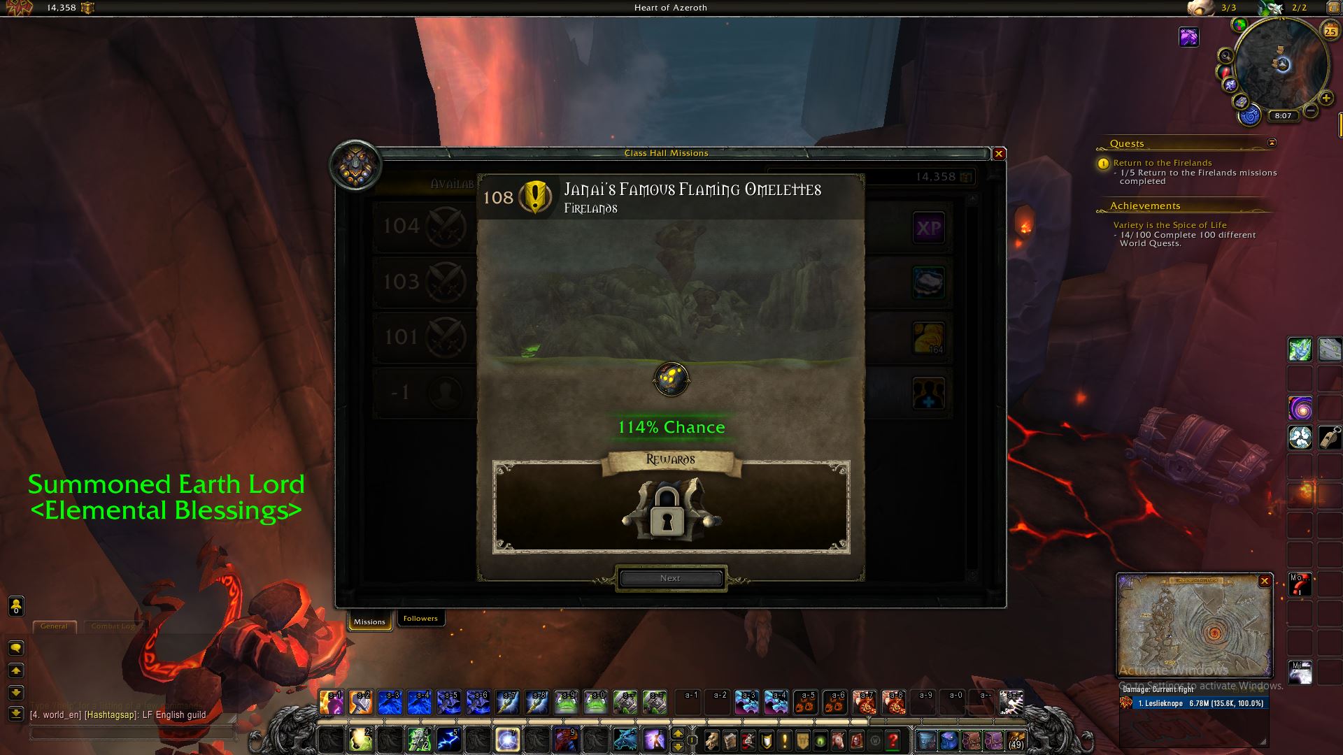 | Description | I can't complete the mission Jaina's Famous Flaming Omelettes which is required to finish the Shaman questline Return to the Firelands. My character name is LeslieKnope | ||||
