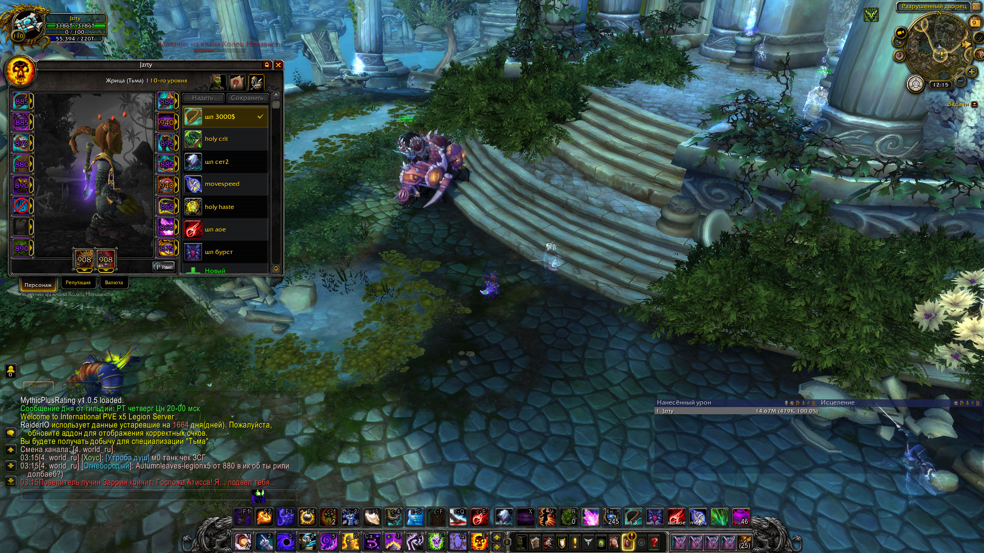 Странно, что такая проблема есть, у меня всё работает (да и не только у меня). Бывает, что настройку аддона не сохраняло, а так всё ок. Щас приведу цикл , как можно сделать = )) 0.1-0.3 0.1 Через лаунчер - настройки - проверить на ошибки и.т.п 0.2 Удаляешь папку Cache 0.3 Заходишь в папку WTF-Acc- кароче до папки с персонажем, чистишь там разные cache , саму папку не удаляй. .1 Исправляешь персонажа без телепорта. 1.1 В игре отключаешь голоса рыцарей смерти и питомцев .2 Заходишь на персонажа - делаешь 3 комплекта (ну, допустим тот, что на тебе, потом голый, потом тот, который хочешь сделать) .3 Пишешь в чат .save 2 раза минимум, пока надпись (игрок сохранен) не появится. .4 Выходишь из мира (окно выбора персонажа) . Заходишь обратно, проверяешь. Если не помогло, делай 3-4 шаг раза 2-3 . Ну если уж ниче не помогло, то это странно. |