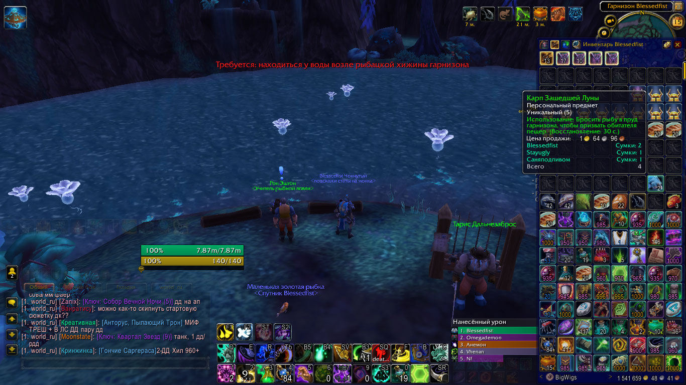 | Description | Не используется карп зашедшей луны ( https://ru.wowhead.com/item=116158 ), гарнизон 3 уровня, при попытке использовать выдает ошибку что необходимо находится у воды возле рыбацкой хижины гарнизона. На офе призывал моба https://ru.wowhead.com/npc=85715/ | ||||