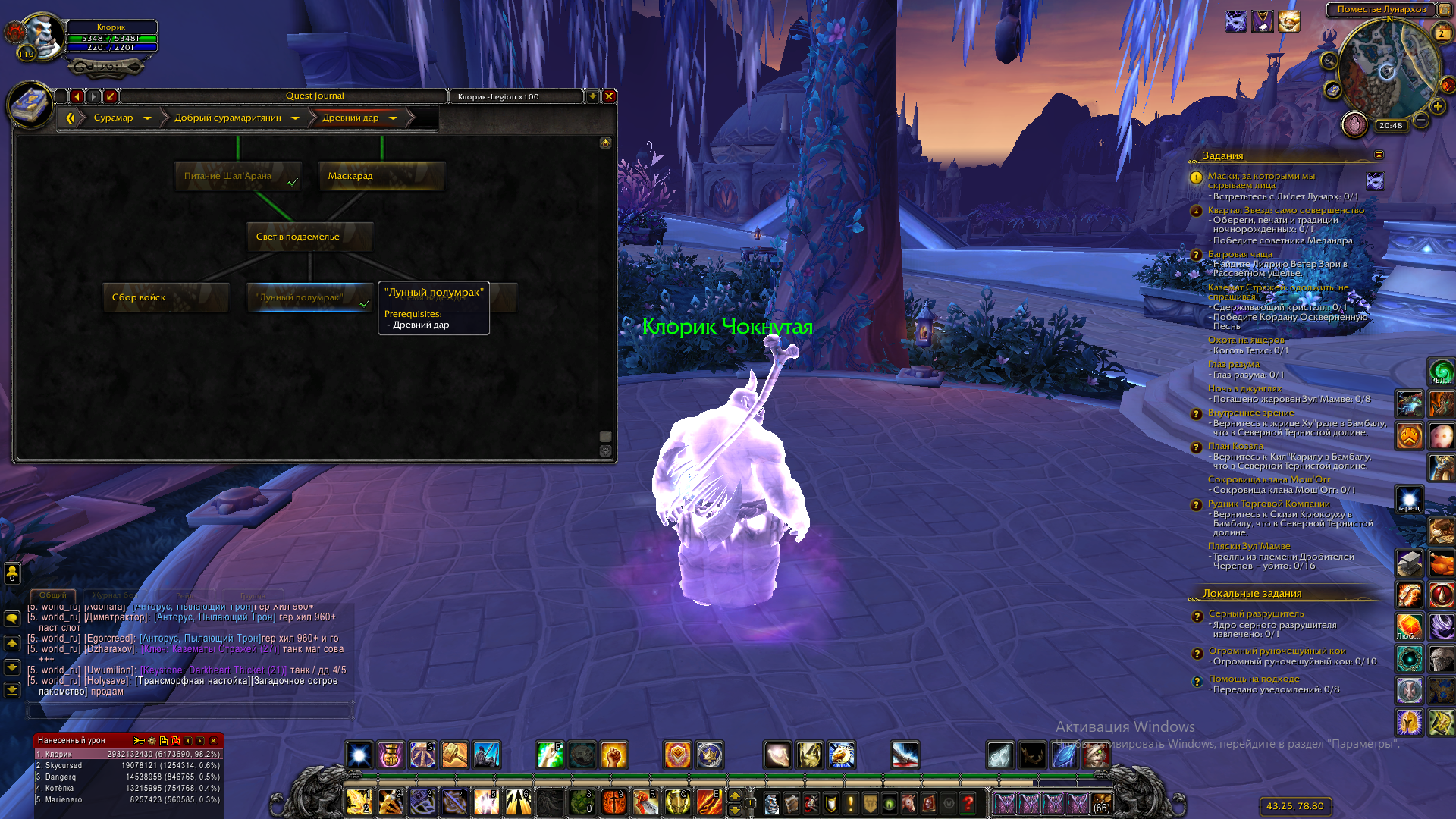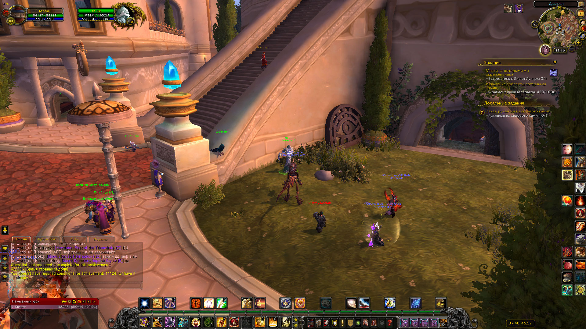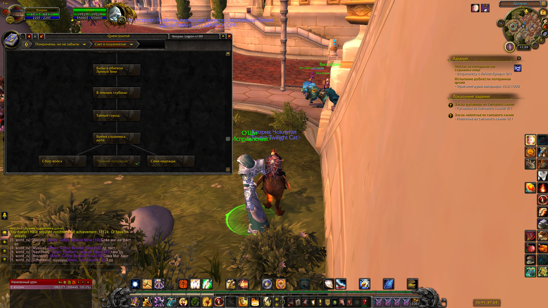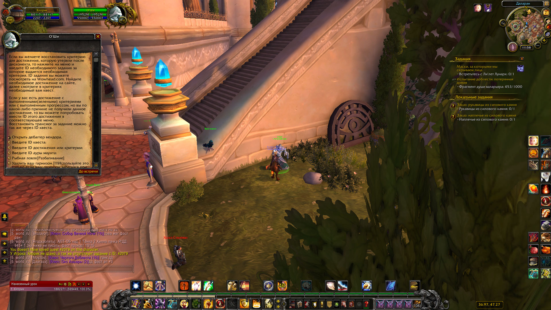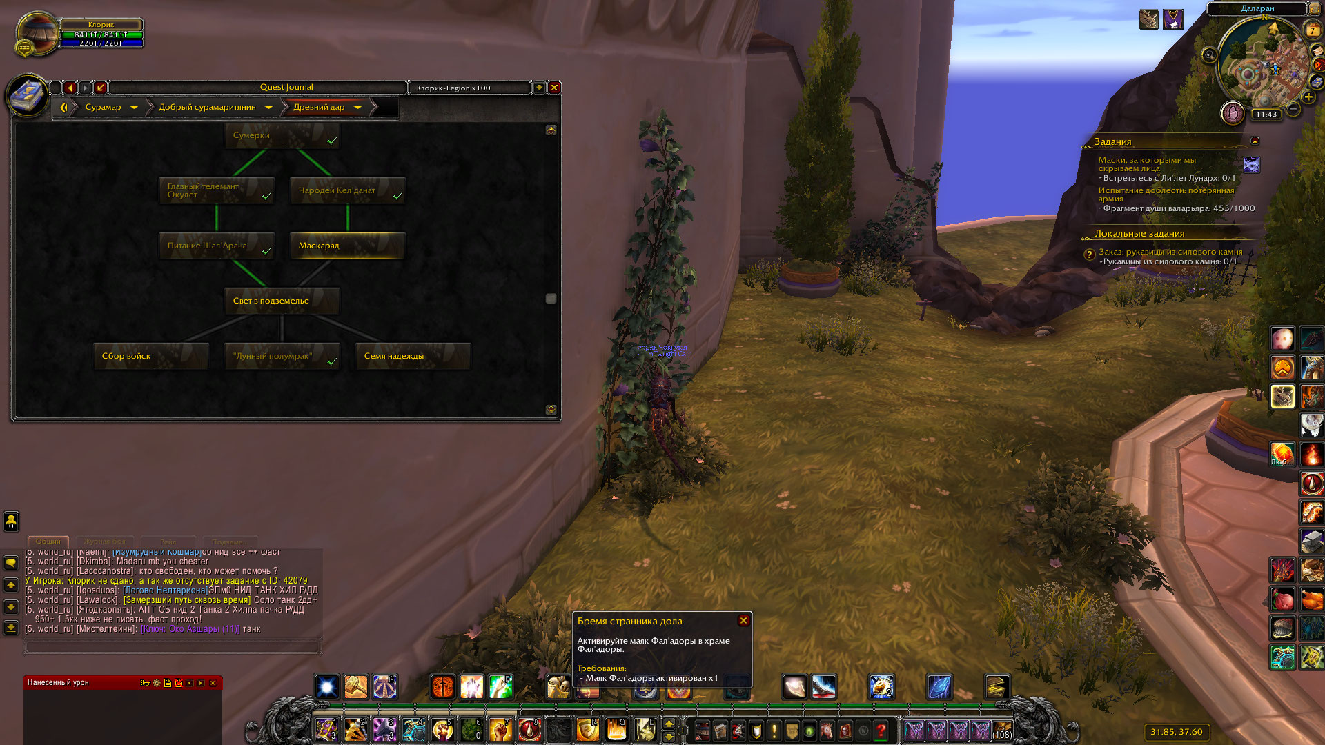 Ох... у меня конец цепочки сделан и начало, по аддону и всему чему можно проверял, визуально то же есть свидетельство, а вот по факту ни ачивы , ни каких либо продолжений и вообще ничего. Последних три скриншота указывают что где то что то не так, так как во время выполнения задания "42230. Бремя странника дола" я открываю маяк Фаладоры, но сам портал в Шаларане не появился (я повторно сегодня его использовал и результата ноль, где маяк тп есть, а в Шаларане его нету. Через НПС Оши ничего не решается (на скринах есть его реакция ) |