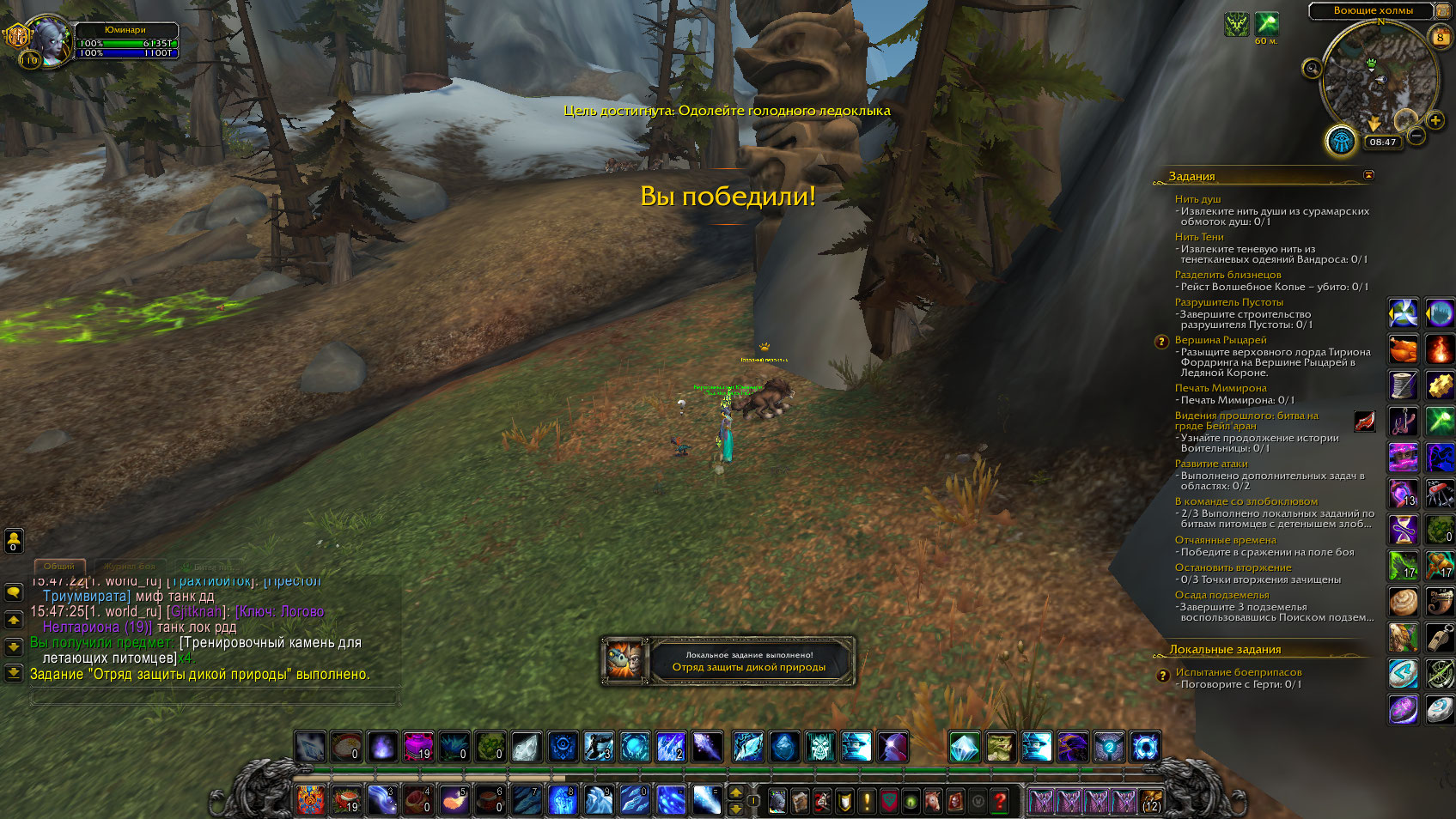 На сегодня получилось получить только https://www.wowhead.com/ru/item=137578/%D1%81%D0%BD%D0%B5%D0%B3%D0%BE%D1%81%D0%BF%D0%B8%D0%BD-%D0%BE%D1%85%D0%BE%D1%82%D0%BD%D0%B8%D0%BA с остальными проблема, что локалки не зачитывает, с 5 локалок засчитало в квест 1. Потом цепочка слетает и все по новой. Но проблема в самих локалках так как они и сами не засчитываются и в квест не идут. |